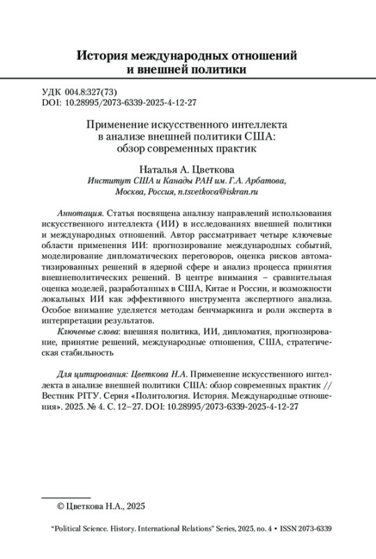 10. Tsvetkova 2025 - Tsvetkova N.A. The predictive power of historical analogies in foreign policy decision-making: An AI-assisted approach [Preprint] // Humanities and Social Sciences Communications. Springer Nature/Research Square, 2025. URL: https://www.researchsquare.com/article/rs-6490065 (дата обращения 04.03.2025).