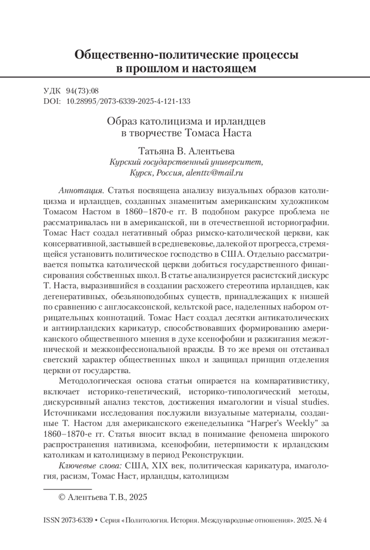 Статья посвящена анализу визуальных образов католицизма и ирландцев, созданных знаменитым американским художником Томасом Настом в 1860–1870-е гг. В подобном ракурсе проблема не рассматривалась ни в американской, ни в отечественной историографии. Томас Наст создал негативный образ римско-католической церкви, как консервативной, застывшей в средневековье, далекой от прогресса, стремящейся установить политическое господство в США. Отдельно рассматривается попытка католической церкви добиться государственного финансирования собственных школ. В статье анализируется расистский дискурс Т. Наста, выразившийся в создании расхожего стереотипа ирландцев, как дегенеративных, обезьяноподобных существ, принадлежащих к низшей по сравнению с англосаксонской, кельтской расе, наделенных набором отрицательных коннотаций. Томас Наст создал десятки антикатолических и антиирландских карикатур, способствовавших формированию американского общественного мнения в духе ксенофобии и разжигания межэтнической и межконфессиональной вражды. В то же время он отстаивал светский характер общественных школ и защищал принцип отделения церкви от государства. Методологическая основа статьи опирается на компаративистику, включает историко-генетический, историко-типологический методы, дискурсивный анализ текстов, достижения имагологии и visual studies. Источниками исследования послужили визуальные материалы, созданные Т. Настом для американского еженедельника “Harper’s Weekly” за 1860–1870-е гг. Статья вносит вклад в понимание феномена широкого распространения нативизма, ксенофобии, нетерпимости к ирландским католикам и католицизму в период Реконструкции.