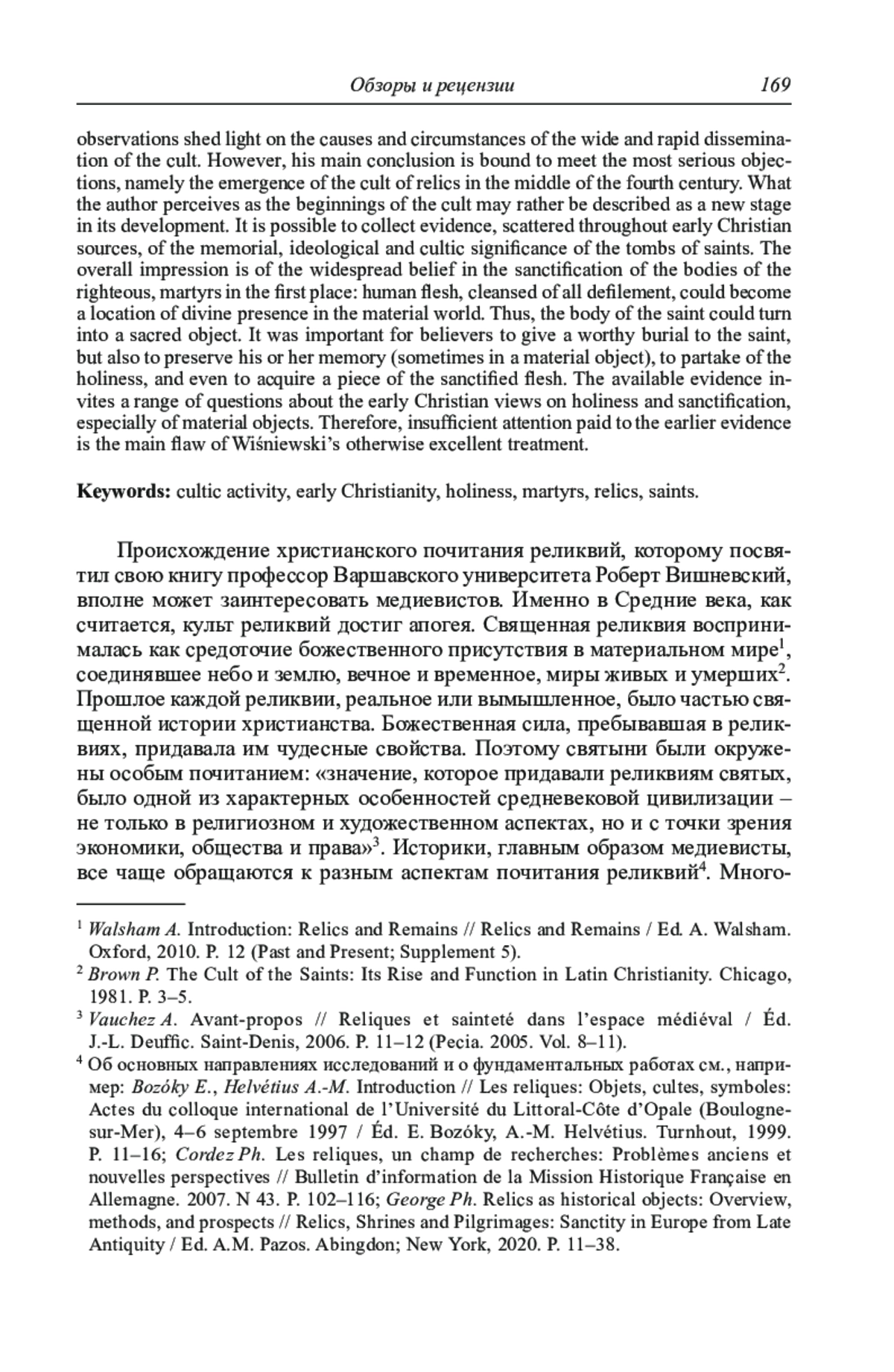 Культ реликвий, унаследованный от поздней античности, стал одной из главных особенностей средневекового христианства. К этой теме обращаются многие медиевисты, поэтому систематический обзор состояния культа в предшествующую эпоху представляет определенный интерес. В своей книге Роберт Вишневский последовательно описывает разные аспекты почитания реликвий в IV–VI вв., обращая особое внимание на способы вступить в контакт со святыней и использовать ее сверхъестественную силу на благо людей. Автор делает интересные наблюдения, которые проливают свет на причины и обстоятельства широкого распространения культа реликвий. Вместе с тем концепция автора вызывает возражения: то, что Вишневский понимает под возникновением культа, можно считать скорее очередным этапом его развития. Рассматривая культ реликвий с определенной точки зрения и руководствуясь средневековыми критериями, автор отрицает его существование до середины IV в. Рецензент высказывает несогласие с этой позицией и приводит свидетельства раннехристианских источников о мемориальном, идеологическом и культовом значении гробниц святых.
