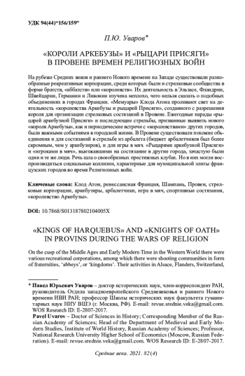 На рубеже Средних веков и раннего Нового времени на Западе существовали разнообразные рекреативные корпорации, среди которых были и стрелковые сообщества в форме братств, «аббатств» или «королевств». Их деятельность в Эльзасе, Фландрии, Швейцарии, Германии и Ливонии изучена неплохо, чего нельзя сказать о подобных объединениях в городах Франции. «Мемуары» Клода Атона проливают свет на деятельность «королевства Аркебузы и рыцарей Присяги», созданного с разрешения короля для организации стрелковых состязаний в Провене. Ежегодные парады «рыцарей аркебузной Присяги» и последующие стрельбы, призванные выявить нового «короля Аркебузы», как и периодические встречи с «королевствами» других городов, были важными событиями в городской жизни. В Провене существовали похожие объединения и для состязаний в стрельбе из арбалета (бюджет арбалетчиков был более скромным, чем у аркебузиров), и для игры в мяч. «Рыцарями аркебузной Присяги» и «игроками в мяч», выезжавшими на состязание в другие города, зачастую были одни и те же люди. Речь шла о своеобразных престижных клубах. Но в них могли воспроизводиться социальные коллизии, характерные для муниципальной элиты французских городов во время Религиозных войн