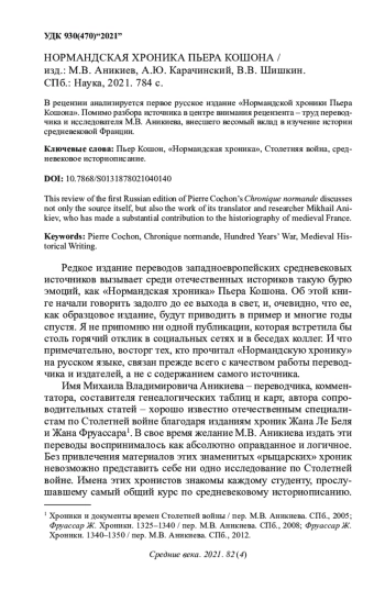 Статья: НОРМАНДСКАЯ ХРОНИКА ПЬЕРА КОШОНА / ИЗД.: М. В. АНИКИЕВ, А. Ю. КАРАЧИНСКИЙ, В. В. ШИШКИН. СПБ.: НАУКА, 2021. 784 С. (2021)