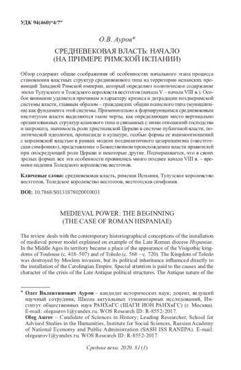 АУРОВ О. В. СРЕДНЕВЕКОВАЯ ВЛАСТЬ: НАЧАЛО (НА ПРИМЕРЕ РИМСКОЙ ИСПАНИИ) // СРЕДНИЕ ВЕКА. 2020. Т. 81 № 1