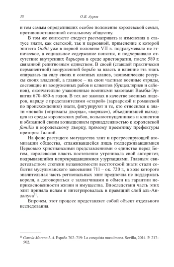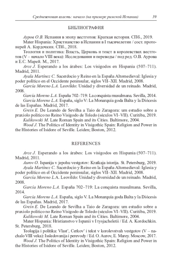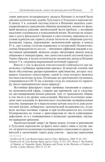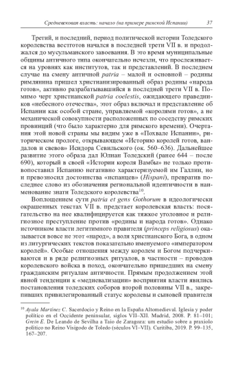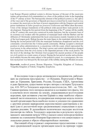 Обзор содержит общие соображения об особенностях начального этапа процесса становления властных структур средневекового типа на территории испанских провинций Западной Римской империи, который определяет политическое содержание эпохи Тулузского и Толедского королевств вестготов (начала V – начала VIII в.). Особое внимание уделяется причинам и характеру кризиса и деградации позднеримской системы власти, главным образом – гражданских общин полисного типа (муниципиев) как фундамента этой системы. Применительно к формирующимся средневековым институтам власти выделяются такие черты, как определяющее место вертикально организованных структур кланового типа и связанных с ними отношений господства и патроната, значимость роли христианской Церкви в системе публичной власти, политической идеологии, пропаганде и культуре, особые формы ее взаимоотношений с королевской властью в рамках модели позднеантичного цезарепапизма («вестготская симфония»), представление о Божественном происхождении власти правителей при опосредующей роли Церкви и некоторые другие. Подчеркивается, что в своих зрелых формах все эти особенности проявились много позднее начала VIII в. – времени падения Толедского королевства вестготов