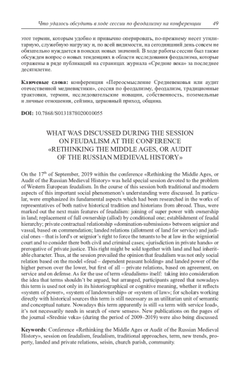 17 сентября 2019 г. в рамках конференции «Переосмысление Средневековья или аудит российской медиевистики» прошла сессия, посвященная проблемам западноевропейского феодализма. Были обсуждены как традиционные, так и новые аспекты исследования этого социального феномена. В частности, подчеркнуты важные признаки феодализма, о которых писали как представители отечественной исторической школы, так и многие зарубежные авторы. Это соединение верховной власти с землевладением; замена полной земельной собственности (аллода) условной; установление вассальной иерархии; наличие личных договорных отношений господства и подчинения между сеньором и вассалом, основанных на коммендации; «юрисдикция в частных руках» или право сеньора на частный суд, которое могло передаваться по наследству. Было показано, что феодализм это не только наличие социальных отношений по типу: феод – зависимое крестьянское земельное держание и связанная с этими отношениями власть высшего над низшим. Это не чисто вещная (более всего – «земельная») основа зависимости крестьян от сеньоров, но в значительной степени – личные отношения, договорный союз между ними, основанный на службе одного другому и защите первого вторым. В ходе работы сессии было также уделено внимание использованию классического термина «феодализм». Памятуя, что о терминах не спорят, а договариваются, историки согласились в том, что, какой бы аспект или сумму аспектов в бытовании средневекового социума ни отражал этот термин (систему власти – систему землевладения – систему права), он является не только «историографическим феноменом» и, как важный объект познания, наполнен не только онтологическим смыслом. Для практикующих историков этот термин, которым удобно и привычно оперировать, по-прежнему несет утилитарную, служебную нагрузку и, по всей видимости, на сегодняшний день совсем не обязательно нуждается в поисках новых значений. В ходе работы сессии был также обсужден вопрос о новых тенденциях в области исследования феодализма, которые отражены в ряде публикаций на страницах журнала «Средние века» за последнее десятилетие