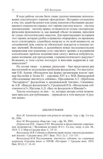17 сентября 2019 г. в рамках конференции «Переосмысление Средневековья или аудит российской медиевистики» прошла сессия, посвященная проблемам западноевропейского феодализма. В ходе этой сессии, которую вели С. Ю. Агишев и М. В. Винокурова и которая длилась полтора часа, удалось кратко обсудить некоторые традиционные и новые аспекты исследования этого социального феномена. Были, в частности, подчеркнуты важные признаки феодализма, о которых писали как представители отечественной исторической школы (исследовавшие его на примере таких стран и регионов средневекового Запада, как Франция, Англия, Германия, Италия, Пиренейский полуостров), так и многие зарубежные авторы. Так, например, П. Г. Виноградов в своей работе «Villainage in England» выделял 3 основных признака феодализма: соединение верховной власти с землевладением; замена полной земельной собственности (аллода) условной; установление вассальной иерархии 1. Ф. Мейтленд и Ф. Поллок разделяли это мнение, подчеркивая тезис об особом значении личных договорных отношений господства и подчинения между сеньором и вассалом. Так, они отмечали наличие трояких отношений между держателем и сеньором: личные (коммендация), отношения службы, связанные с землей, судебные – т. е. право лорда принуждать население сеньории или манора судиться в курии лорда 2. Ф. Мейтденд считал одной из самых характерных черт феодализма наличие юрисдикции в частных руках. Он отмечал, что нет ничего более важного, когда мы говорим о феодализме, чем частный суд, который может быть передан по наследству и продан вместе с землей. Это мнение разделили впоследствии Д. М. Петрушевский, А. Я. Гуревич, М. Блок3 и многие другие известные историки