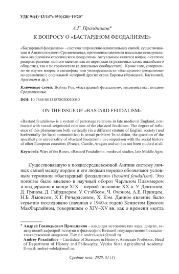 ПРАЗДНИКОВ А. Г. К ВОПРОСУ О "БАСТАРДНОМ ФЕОДАЛИЗМЕ" // СРЕДНИЕ ВЕКА. 2020. Т. 81 № 1