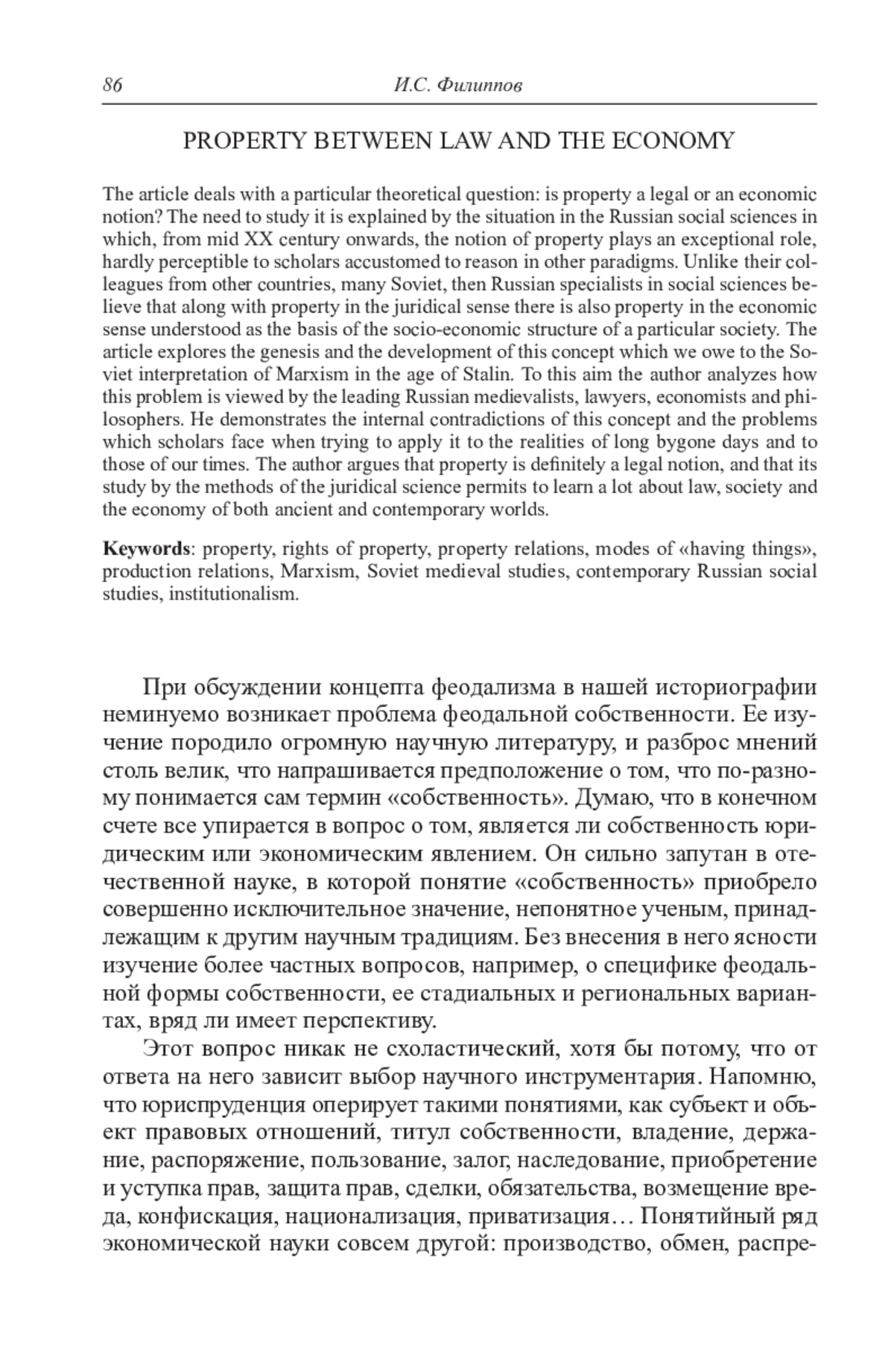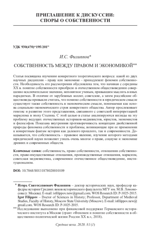 ФИЛИППОВ И. С. СОБСТВЕННОСТЬ МЕЖДУ ПРАВОМ И ЭКОНОМИКОЙ // СРЕДНИЕ ВЕКА. 2020. Т. 81 № 1