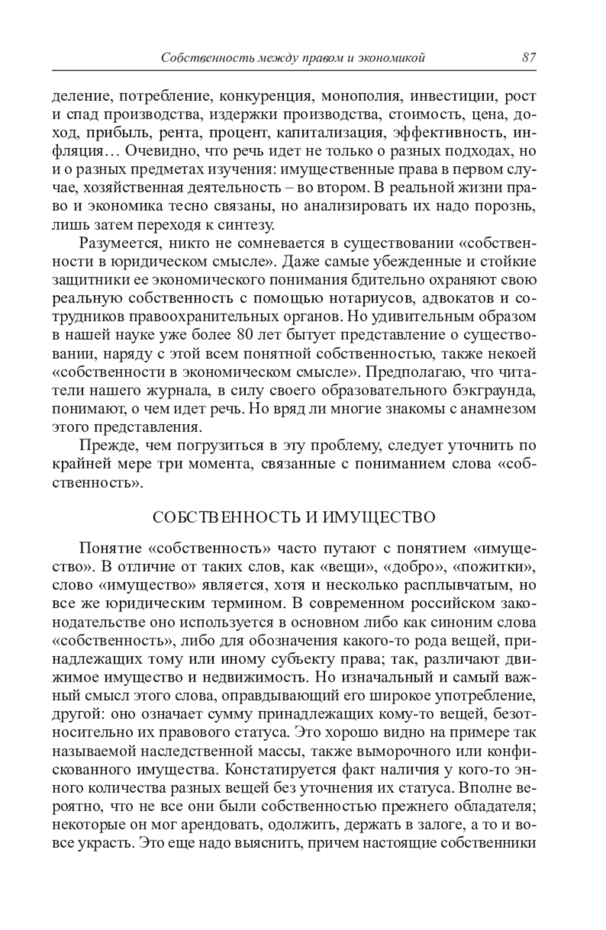 Статья посвящена изучению конкретного теоретического вопроса: какой из двух научных дисциплин – праву или экономике – принадлежит феномен собственности. Необходимость его рассмотрения обусловлена тем, что начиная с середины XX в. понятие собственности приобрело в отечественном обществоведении совершенно исключительное значение, непонятное ученым, привыкшим мыслить в иных парадигмах. В отличие от зарубежных коллег, советские, а затем российские обществоведы привыкли считать, что помимо собственности в юридическом смысле существует также собственность в экономическом смысле, понимаемая как основа социально-экономического строя конкретного общества. Автор прослеживает генезис и развитие этого представления, связанного с советской интерпретацией марксизма в эпоху Сталина. С этой целью в статье анализируются взгляды на эту проблему ведущих отечественных историков-медиевистов, юристов, экономистов и философов. Показана внутренняя противоречивость концепции двойственной природы феномена собственности и проблемы, возникающие при ее применении к конкретным фактам истории как далекого прошлого, так и современности. Доказывается, что собственность – правовое явление, изучение которого методами юридической науки позволяет узнать очень многое о праве, социуме и экономике древних и современных обществ.