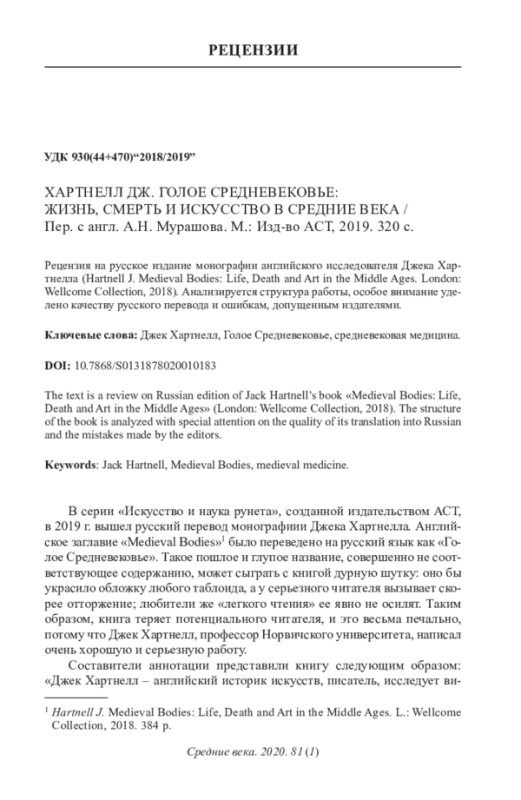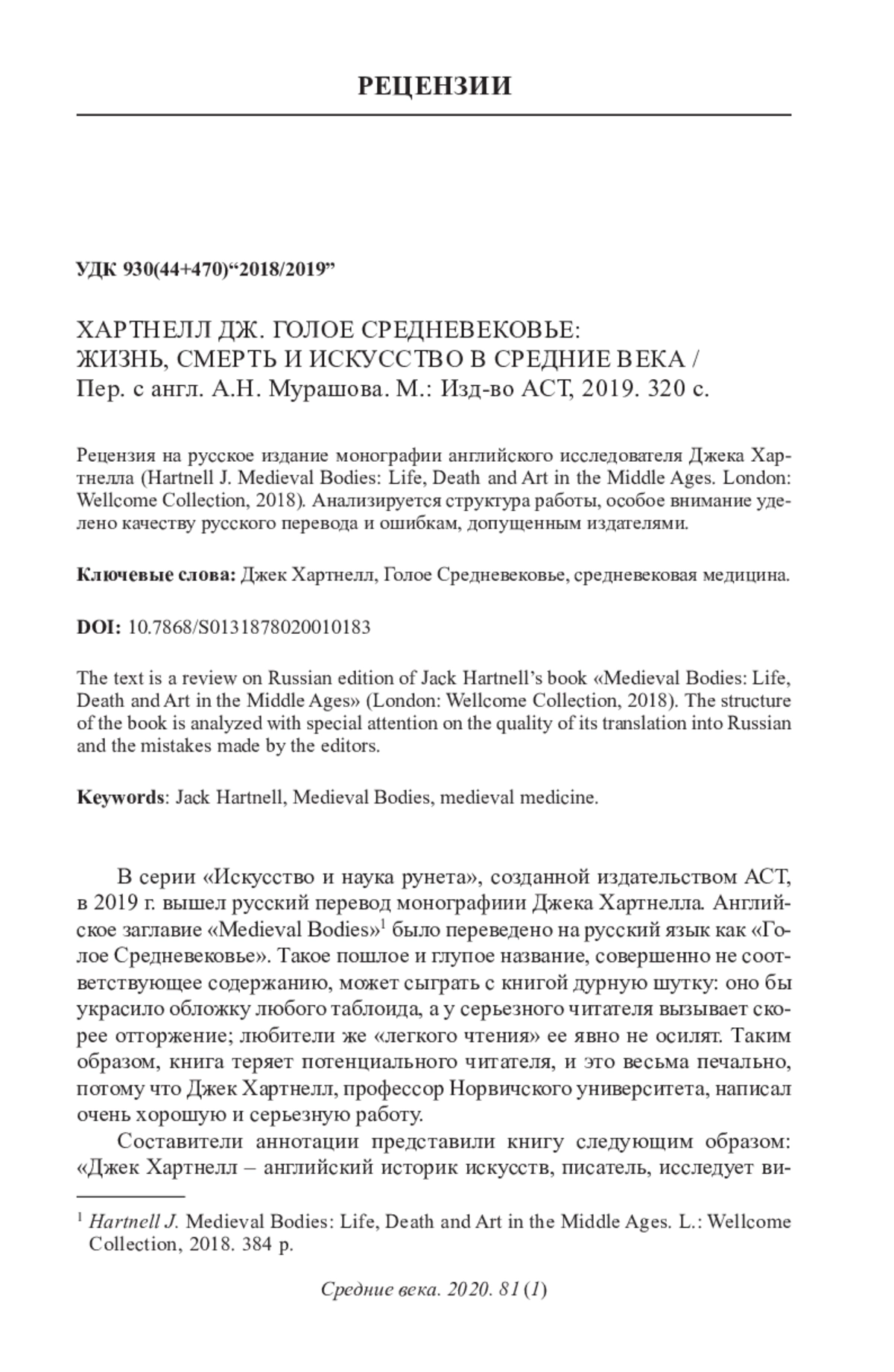 В серии «Искусство и наука рунета», созданной издательством АСТ, в 2019 г. вышел русский перевод монографиии Джека Хартнелла. Английское заглавие «Medieval Bodies»1 было переведено на русский язык как «Голое Средневековье». Такое пошлое и глупое название, совершенно не соответствующее содержанию, может сыграть с книгой дурную шутку: оно бы украсило обложку любого таблоида, а у серьезного читателя вызывает скорее отторжение; любители же «легкого чтения» ее явно не осилят. Таким образом, книга теряет потенциального читателя, и это весьма печально, потому что Джек Хартнелл, профессор Норвичского университета, написал очень хорошую и серьезную работу.