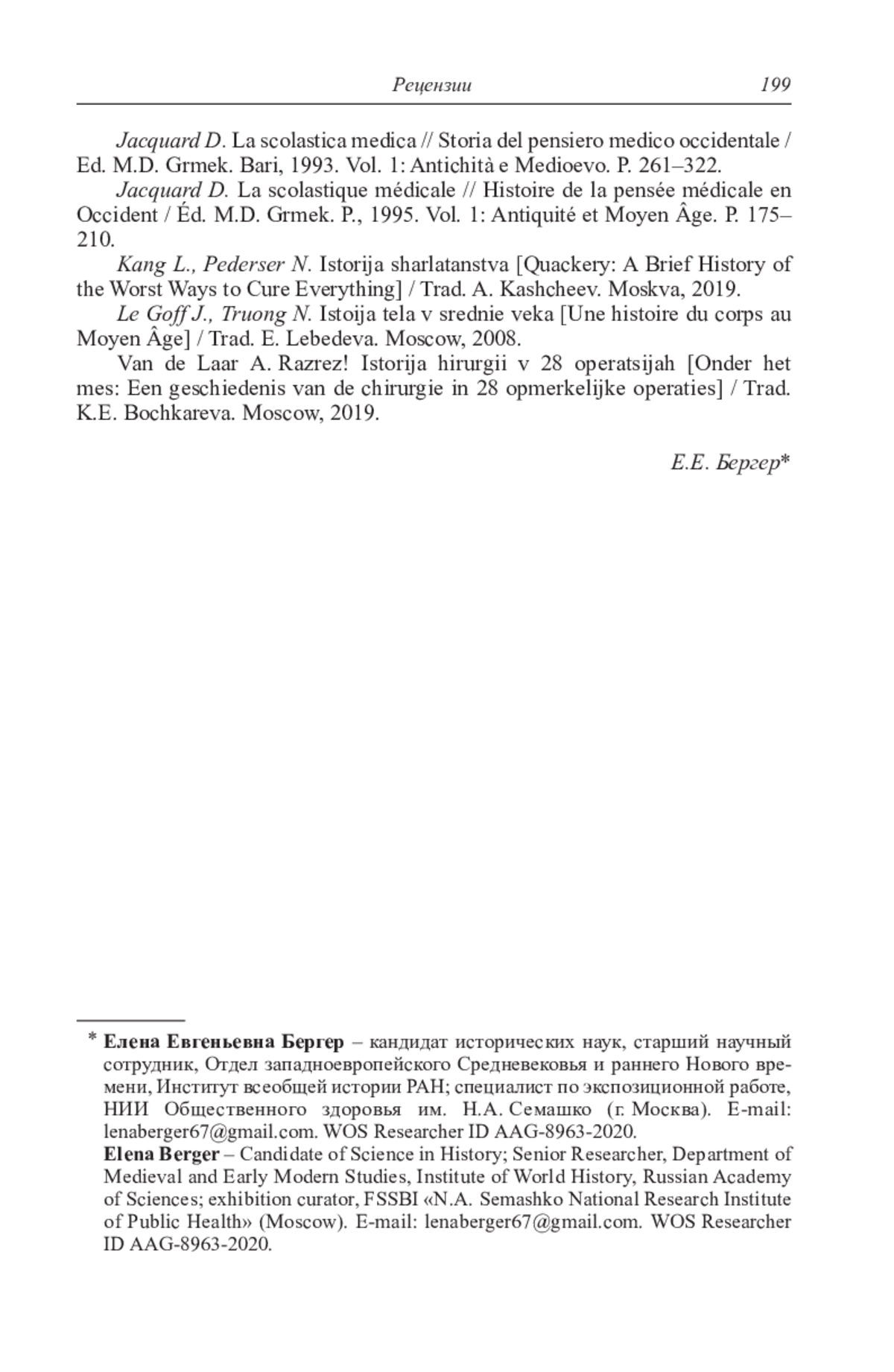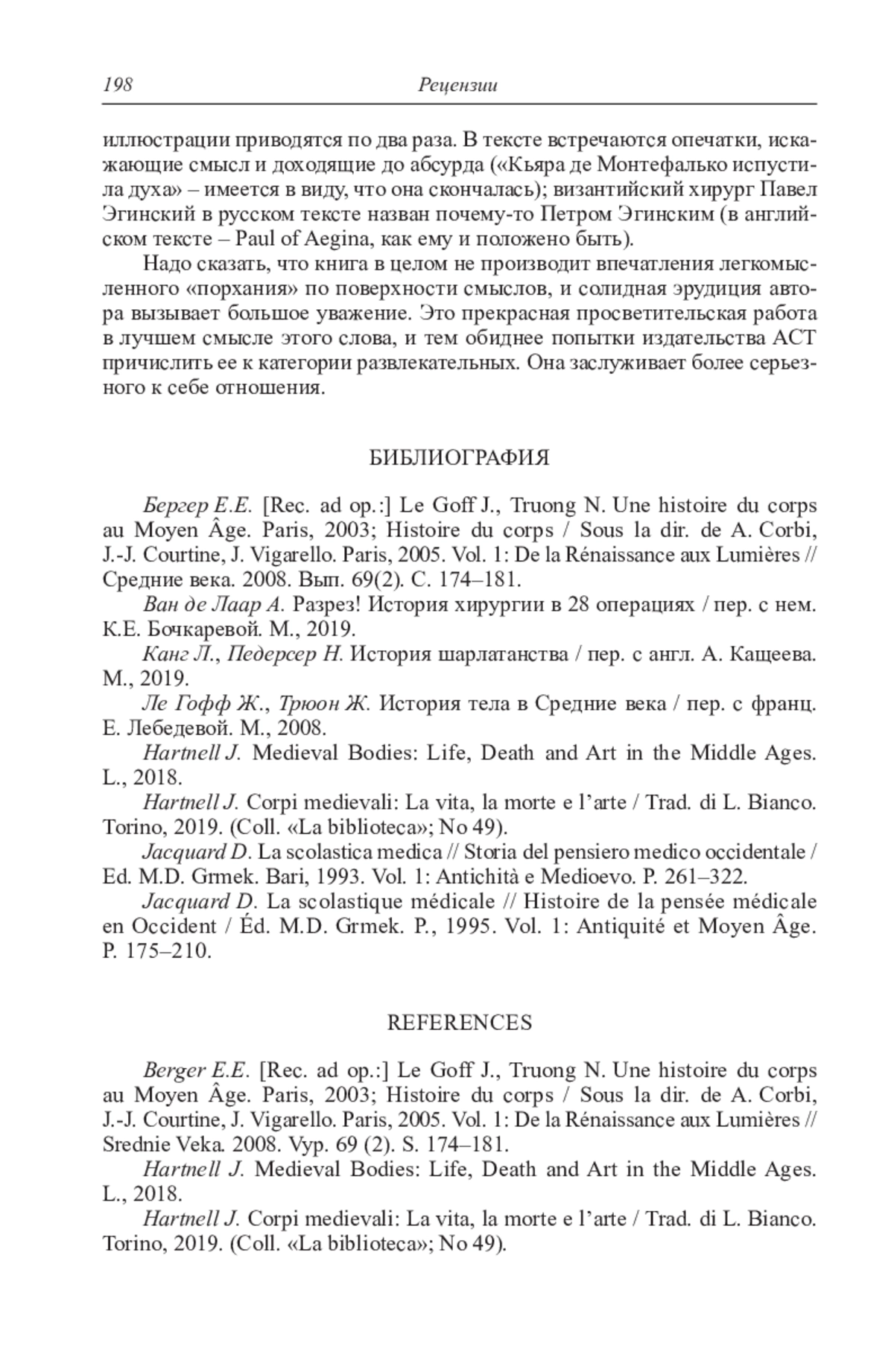 1. Бергер Е.Е. [Rec. ad op.:] Le Goff J., Truong N. Une histoire du corps au Moyen Age. Paris, 2003; Histoire du corps / Sous la dir. de A. Corbi, J. -J. Courtine, J. Vigarello. Paris, 2005. Vol. 1: De la Renaissance aux Lumieres // Средние века. 2008. Вып. 69(2). С. 174-181. EDN: MUEAFX