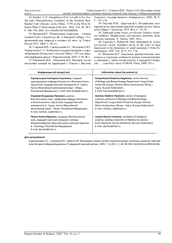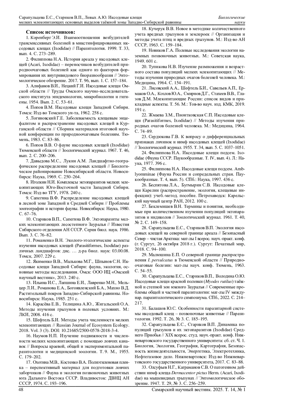 САРАПУЛЬЦЕВА Е. С., СТАРИКОВ В. П., ЛЕВЫХ А. Ю. ИКСОДОВЫЕ КЛЕЩИ МЕЛКИХ МЛЕКОПИТАЮЩИХ ОСНОВНЫХ ВЫДЕЛОВ ТАЁЖНОЙ ЗОНЫ ЗАПАДНО-СИБИРСКОЙ РАВНИНЫ // САМАРСКИЙ НАУЧНЫЙ ВЕСТНИК. 2025. ТОМ 14, № 1