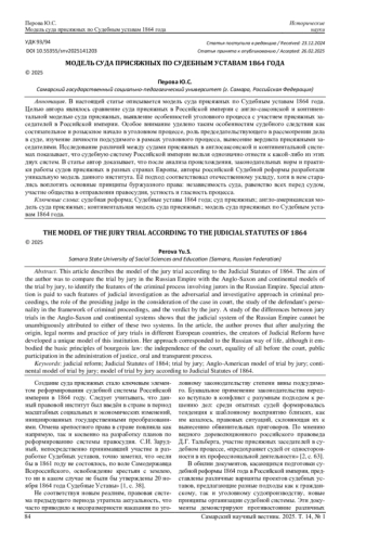 В настоящей статье описывается модель суда присяжных по Судебным уставам 1864 года. Целью автора являлось сравнение суда присяжных в Российской империи с англо-саксонской и континентальной моделью суда присяжных, выявление особенностей уголовного процесса с участием присяжных заседателей в Российской империи. Особое внимание уделено таким особенностям судебного следствия как состязательное и розыскное начало в уголовном процессе, роль председательствующего в рассмотрении дела в суде, изучение личности подсудимого в рамках уголовного процесса, вынесение вердикта присяжными заседателями. Исследование различий между судами присяжных в англосаксонской и континентальной системах показывает, что судебную систему Российской империи нельзя однозначно отнести к какой-либо из этих двух систем. В статье автор доказывает, что после анализа происхождения, законодательных норм и практики работы судов присяжных в разных странах Европы, авторы российской Судебной реформы разработали уникальную модель данного института. Её подход соответствовал отечественному укладу, хотя в нем старались воплотить основные принципы буржуазного права: независимость суда, равенство всех перед судом, участие общества в отправлении правосудия, устность и гласность процесса.