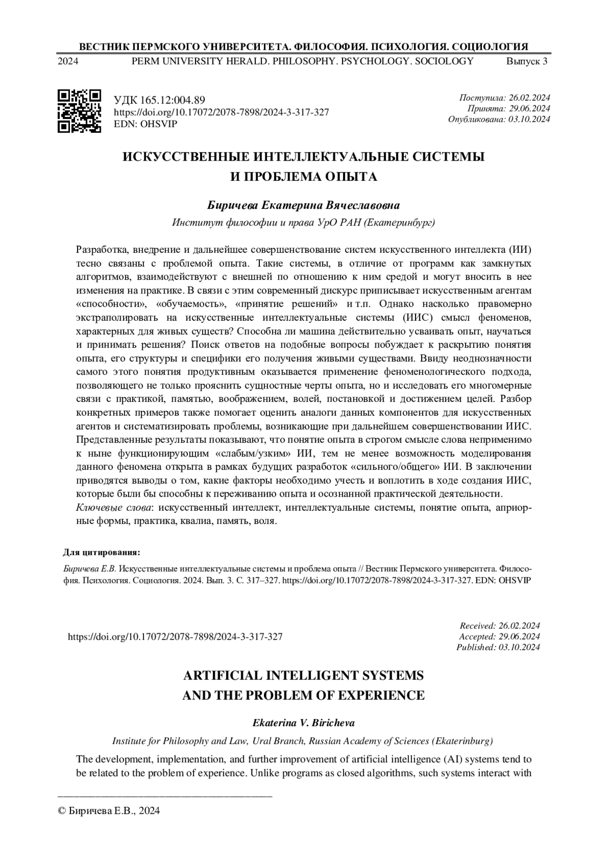 Разработка, внедрение и дальнейшее совершенствование систем искусственного интеллекта (ИИ) тесно связаны с проблемой опыта. Такие системы, в отличие от программ как замкнутых алгоритмов, взаимодействуют с внешней по отношению к ним средой и могут вносить в нее изменения на практике. В связи с этим современный дискурс приписывает искусственным агентам «способности», «обучаемость», «принятие решений» и т. п. Однако насколько правомерно экстраполировать на искусственные интеллектуальные системы (ИИС) смысл феноменов, характерных для живых существ? Способна ли машина действительно усваивать опыт, научаться и принимать решения? Поиск ответов на подобные вопросы побуждает к раскрытию понятия опыта, его структуры и специфики его получения живыми существами. Ввиду неоднозначности самого этого понятия продуктивным оказывается применение феноменологического подхода, позволяющего не только прояснить сущностные черты опыта, но и исследовать его многомерные связи с практикой, памятью, воображением, волей, постановкой и достижением целей. Разбор конкретных примеров также помогает оценить аналоги данных компонентов для искусственных агентов и систематизировать проблемы, возникающие при дальнейшем совершенствовании ИИС. Представленные результаты показывают, что понятие опыта в строгом смысле слова неприменимо к ныне функционирующим «слабым/узким» ИИ, тем не менее возможность моделирования данного феномена открыта в рамках будущих разработок «сильного/общего» ИИ. В заключении приводятся выводы о том, какие факторы необходимо учесть и воплотить в ходе создания ИИС, которые были бы способны к переживанию опыта и осознанной практической деятельности.