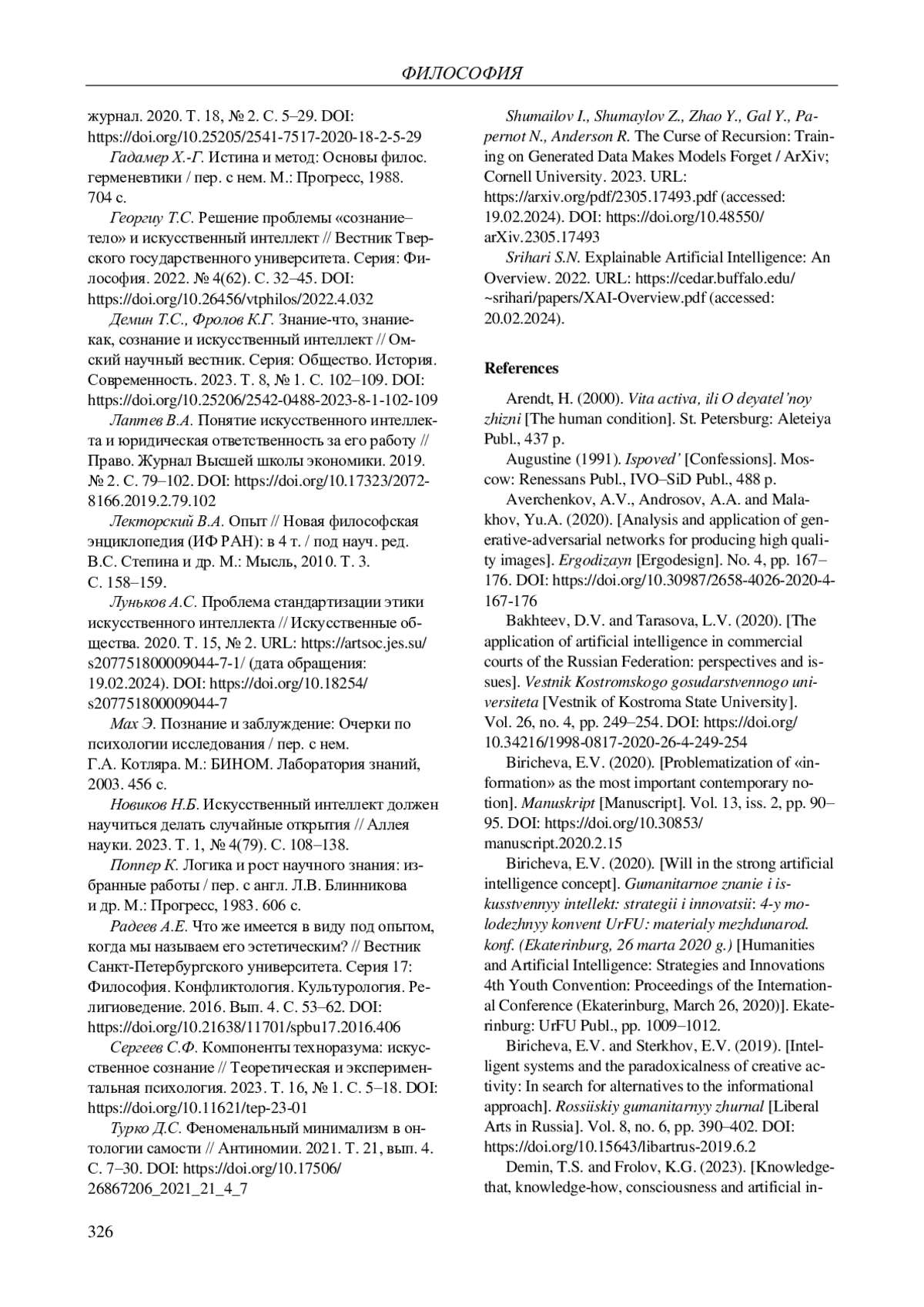 11. Георгиу Т.С. Решение проблемы “сознание-тело” и искусственный интеллект // Вестник Тверского государственного университета. Серия: Философия. 2022. № 4(62). С. 32-45. DOI: 10.26456/vtphilos/2022.4.032 EDN: ERLEVC