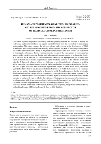 Статья: ЧЕЛОВЕЧЕСКОЕ И ПОСТЧЕЛОВЕЧЕСКОЕ: КАЧЕСТВА, ГРАНИЦЫ И ОТНОШЕНИЯ С ПОЗИЦИЙ ТЕХНОЛОГИЧЕСКОГО ПОСТГУМАНИЗМА (2024)