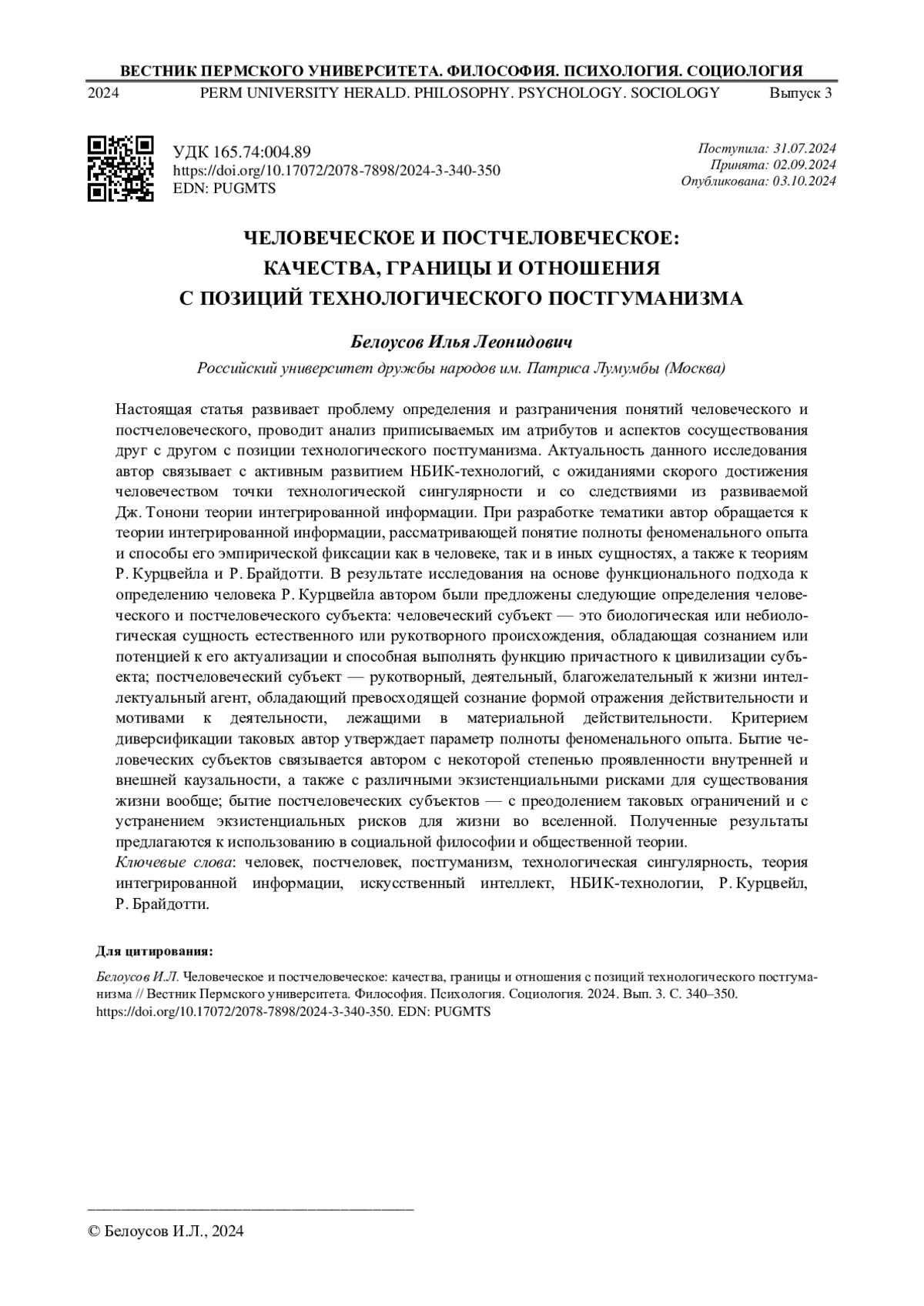 БЕЛОУСОВ И. Л. ЧЕЛОВЕЧЕСКОЕ И ПОСТЧЕЛОВЕЧЕСКОЕ: КАЧЕСТВА, ГРАНИЦЫ И ОТНОШЕНИЯ С ПОЗИЦИЙ ТЕХНОЛОГИЧЕСКОГО ПОСТГУМАНИЗМА // ВЕСТНИК ПЕРМСКОГО УНИВЕРСИТЕТА. ФИЛОСОФИЯ. ПСИХОЛОГИЯ. СОЦИОЛОГИЯ. 2024. № 3
