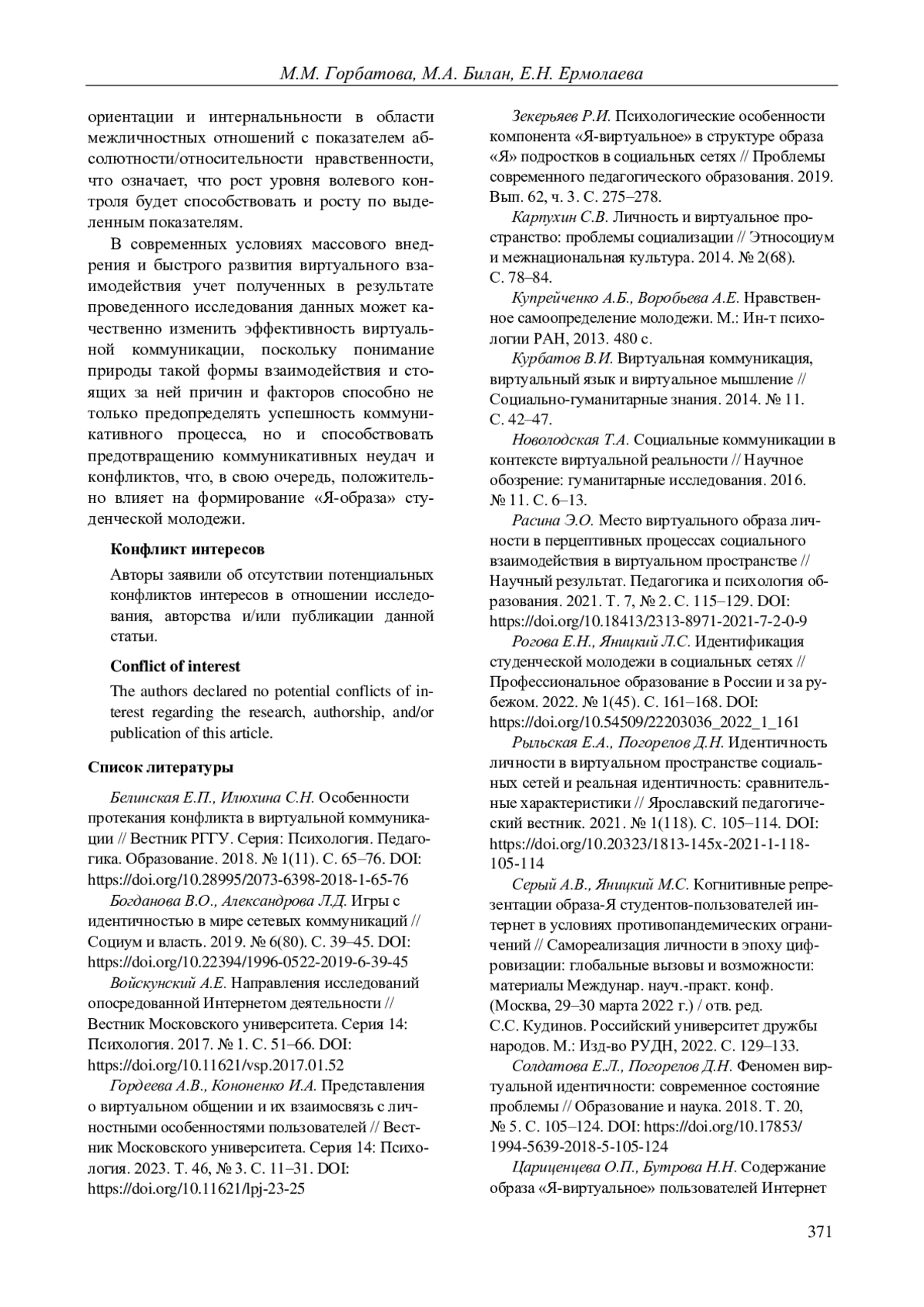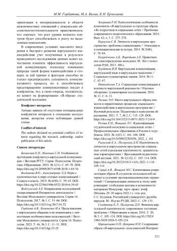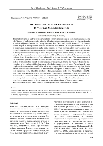 ГОРБАТОВА М. М., БИЛАН М. А., ЕРМОЛАЕВА Е. Н. "Я-ОБРАЗ" СОВРЕМЕННОЙ СТУДЕНЧЕСКОЙ МОЛОДЕЖИ В ПРОСТРАНСТВЕ ВИРТУАЛЬНОЙ КОММУНИКАЦИИ // ВЕСТНИК ПЕРМСКОГО УНИВЕРСИТЕТА. ФИЛОСОФИЯ. ПСИХОЛОГИЯ. СОЦИОЛОГИЯ. 2024. № 3
