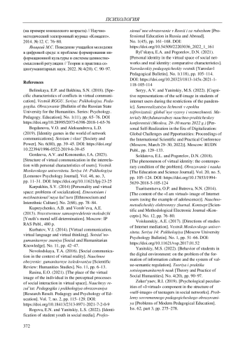 Ключевые фразы: "я-образ", виртуальная идентичность, ИНТЕРНЕТ-ПРОСТРАНСТВО, виртуальная коммуникация, СТУДЕНЧЕСКАЯ МОЛОДЕЖЬ