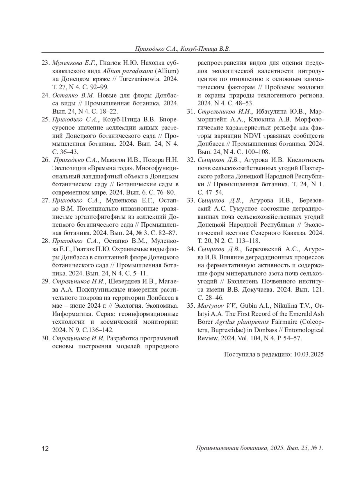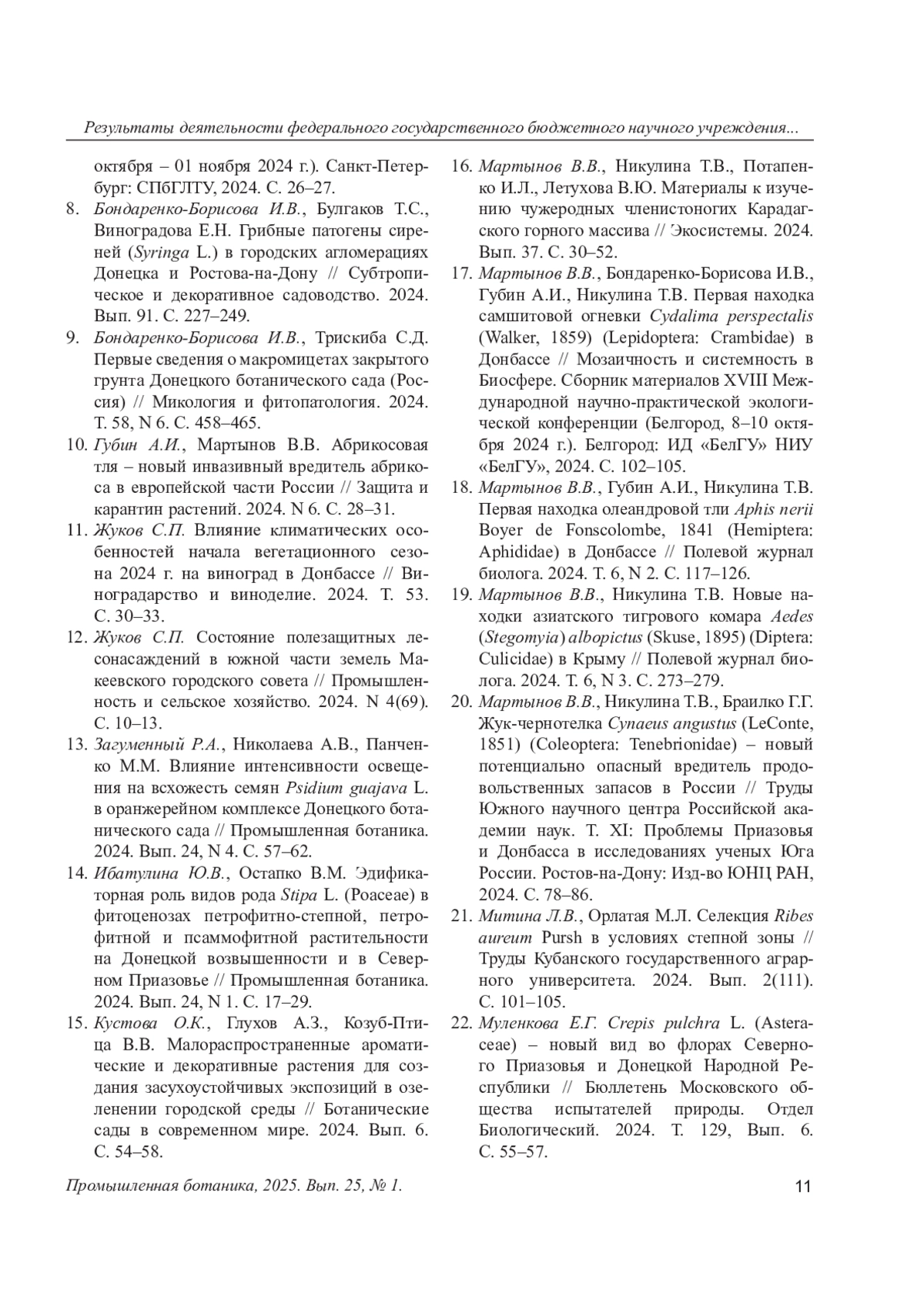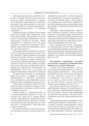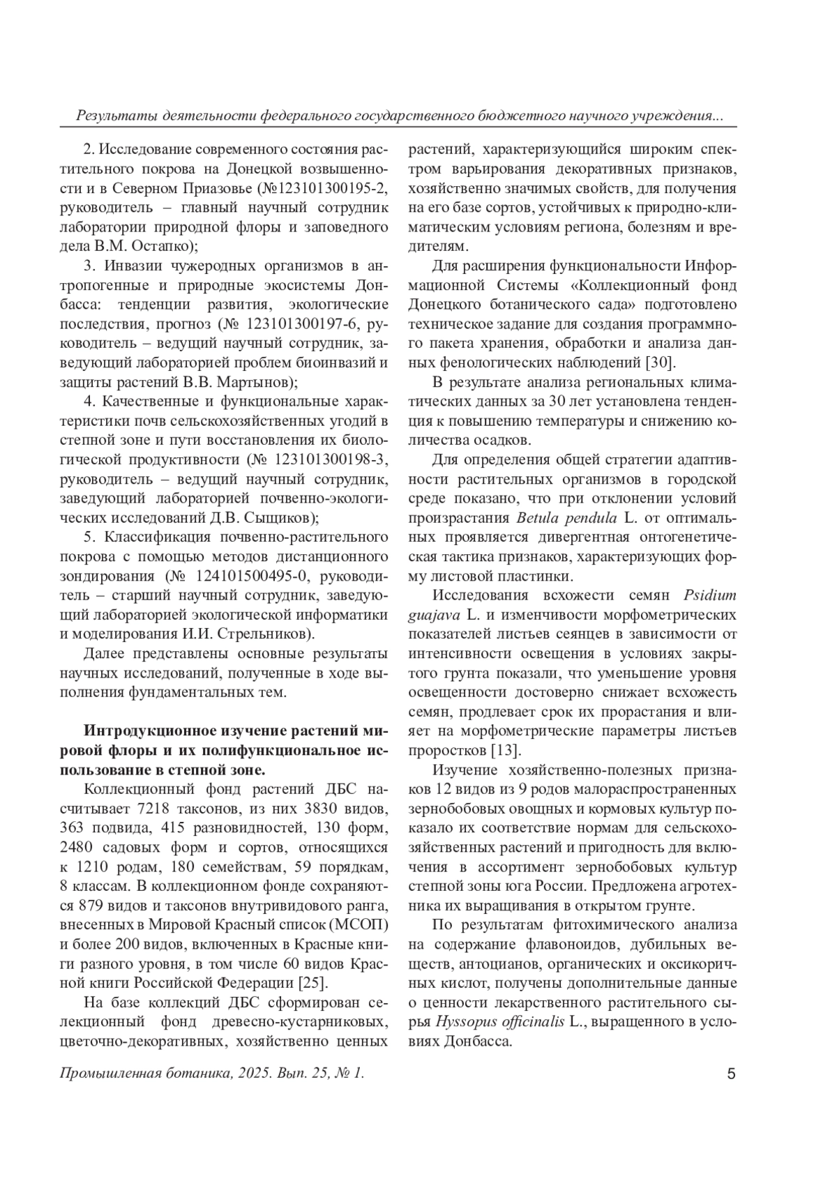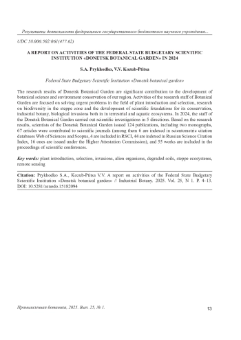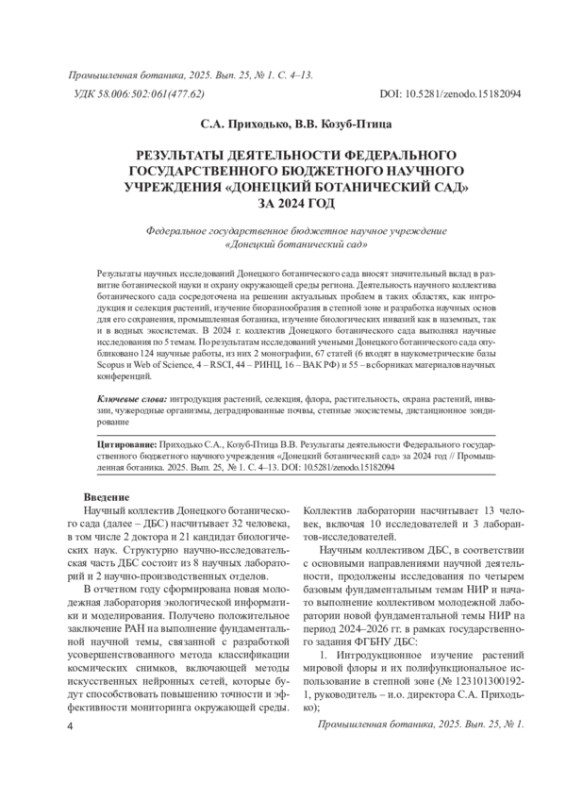 ПРИХОДЬКО С.А., КОЗУБ-ПТИЦА В.В. РЕЗУЛЬТАТЫ ДЕЯТЕЛЬНОСТИ ФЕДЕРАЛЬНОГО ГОСУДАРСТВЕННОГО БЮДЖЕТНОГО НАУЧНОГО УЧРЕЖДЕНИЯ «ДОНЕЦКИЙ БОТАНИЧЕСКИЙ САД» ЗА 2024 ГОД // ПРОМЫШЛЕННАЯ БОТАНИКА. 2025. № 1, ТОМ 25