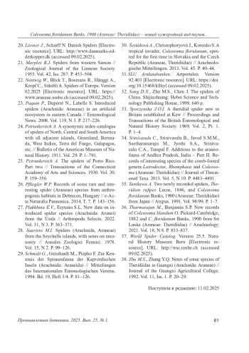 Статья: COLEOSOMA FLORIDANUM BANKS, 1900 (ARANEAE: THERIDIIDAE) - НОВЫЙ ЧУЖЕРОДНЫЙ ВИД ПАУКОВ ДЛЯ ЮГА ЕВРОПЕЙСКОЙ ЧАСТИ РОССИИ (2025)