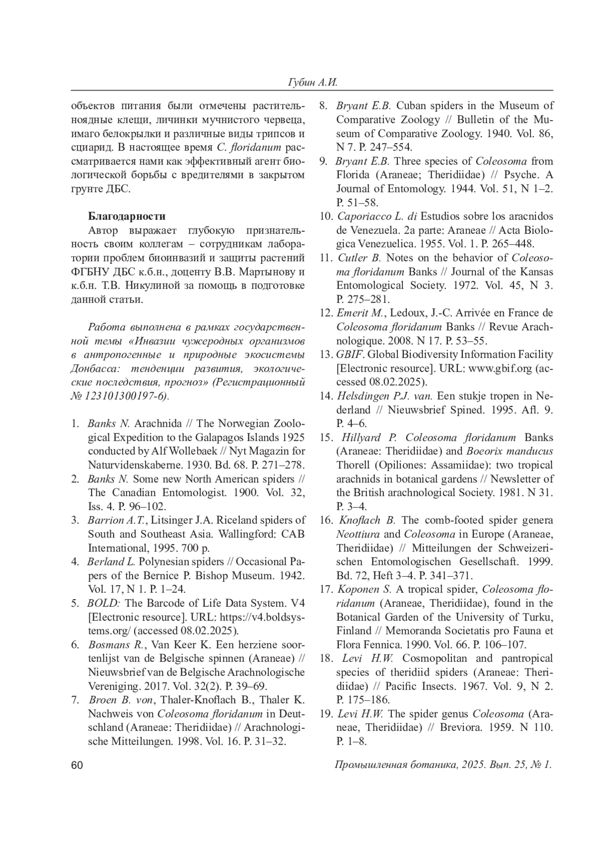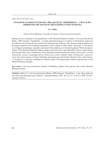 ГУБИН А.И. COLEOSOMA FLORIDANUM BANKS, 1900 (ARANEAE: THERIDIIDAE) - НОВЫЙ ЧУЖЕРОДНЫЙ ВИД ПАУКОВ ДЛЯ ЮГА ЕВРОПЕЙСКОЙ ЧАСТИ РОССИИ // ПРОМЫШЛЕННАЯ БОТАНИКА. 2025. № 1, ТОМ 25