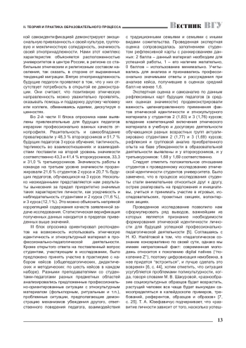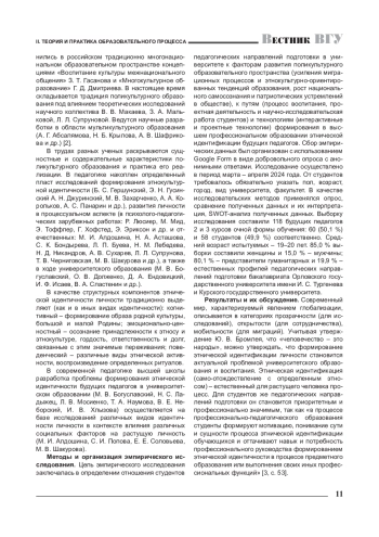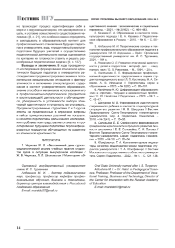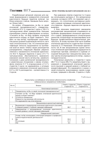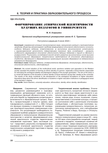 АЛДОШИНА М. И. ФОРМИРОВАНИЕ ЭТНИЧЕСКОЙ ИДЕНТИЧНОСТИ БУДУЩИХ ПЕДАГОГОВ В УНИВЕРСИТЕТЕ // ВЕСТНИК ВОРОНЕЖСКОГО ГОСУДАРСТВЕННОГО УНИВЕРСИТЕТА. СЕРИЯ: ПРОБЛЕМЫ ВЫСШЕГО ОБРАЗОВАНИЯ. 2024. № 3