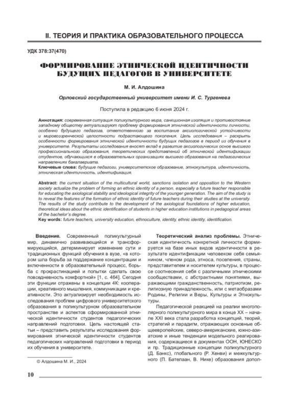 Статья: ФОРМИРОВАНИЕ ЭТНИЧЕСКОЙ ИДЕНТИЧНОСТИ БУДУЩИХ ПЕДАГОГОВ В УНИВЕРСИТЕТЕ (2024)