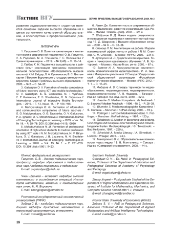 ЗОБОВА С.В., ЧЖАН Ц., ГАЛУСТЯН О. В. МЕДИАКОМПЕТЕНТНОСТЬ СТУДЕНТОВ В СИСТЕМЕ ВЫСШЕГО ОБРАЗОВАНИЯ: ТЕОРЕТИЧЕСКИЙ КОНТЕКСТ // ВЕСТНИК ВОРОНЕЖСКОГО ГОСУДАРСТВЕННОГО УНИВЕРСИТЕТА. СЕРИЯ: ПРОБЛЕМЫ ВЫСШЕГО ОБРАЗОВАНИЯ. 2024. № 3