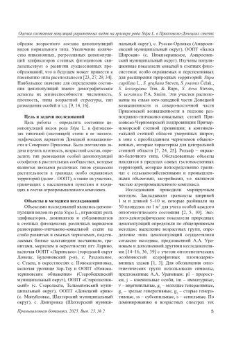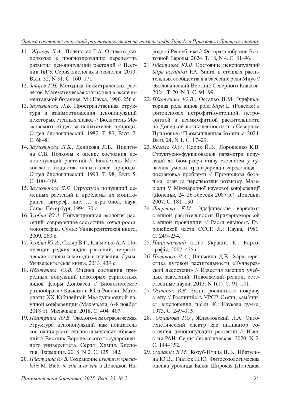 21. Ибатулина Ю.В. Состояние ценопопуляций Stipa ucrainica P.A. Smirn. в степных растительных сообществах в бассейне реки Миус // Экологический Вестник Северного Кавказа. 2024. Т. 20, N 3. С. 94-99.