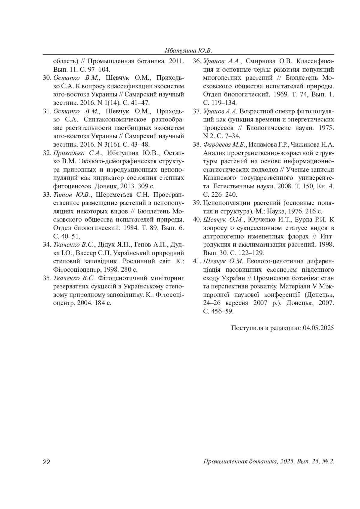 32. Приходько С.А., Ибатулина Ю.В., Остапко В.М. Эколого-демографическая структура природных и итродукционных ценопопуляций как индикатор состояния степных фитоценозов. Донецк, 2013. 309 с.