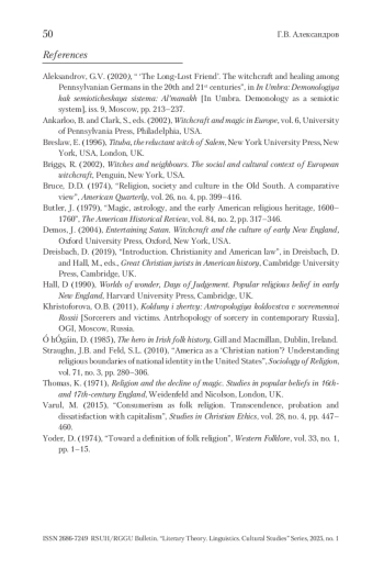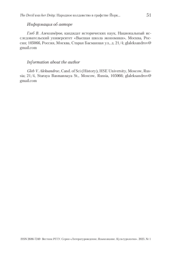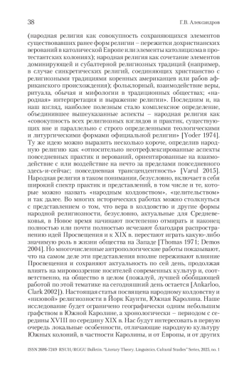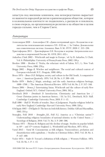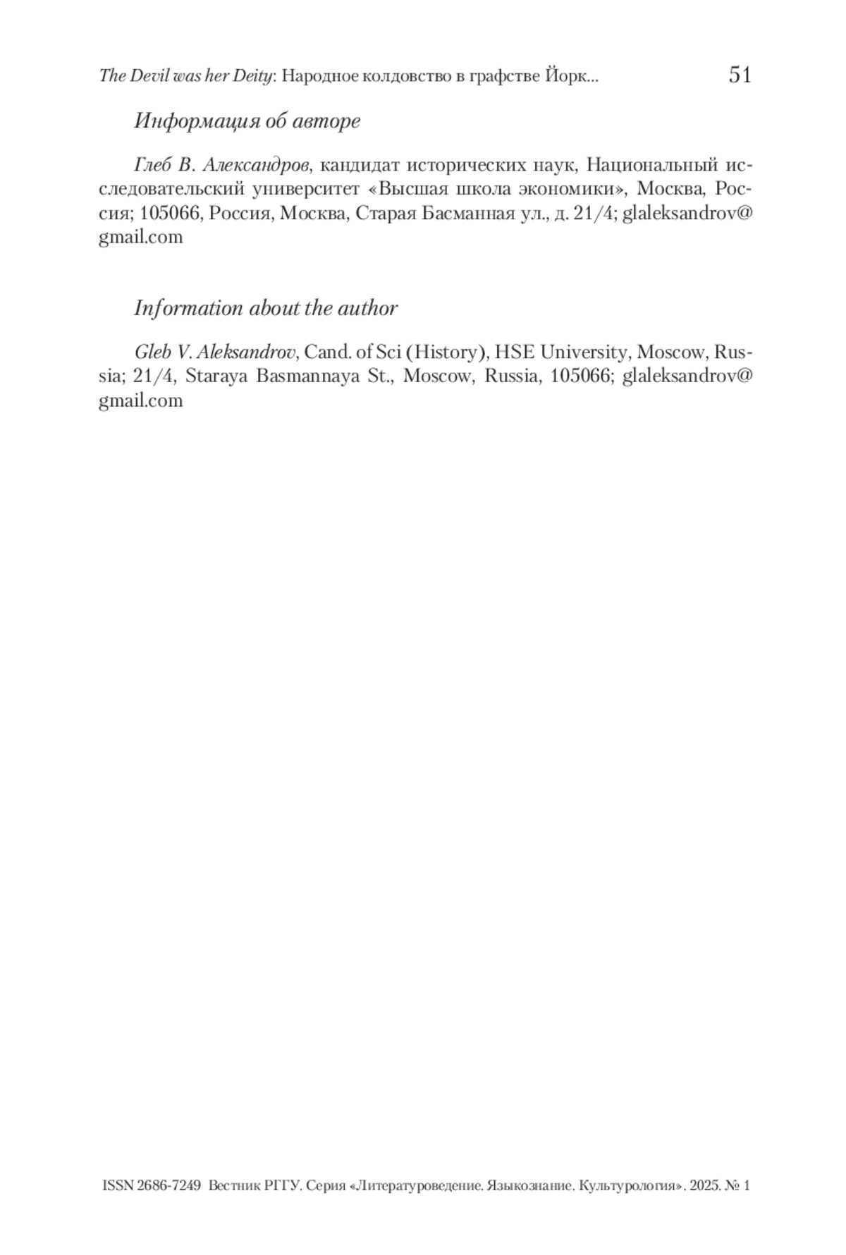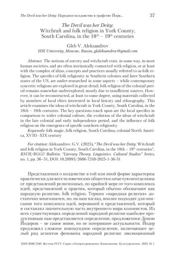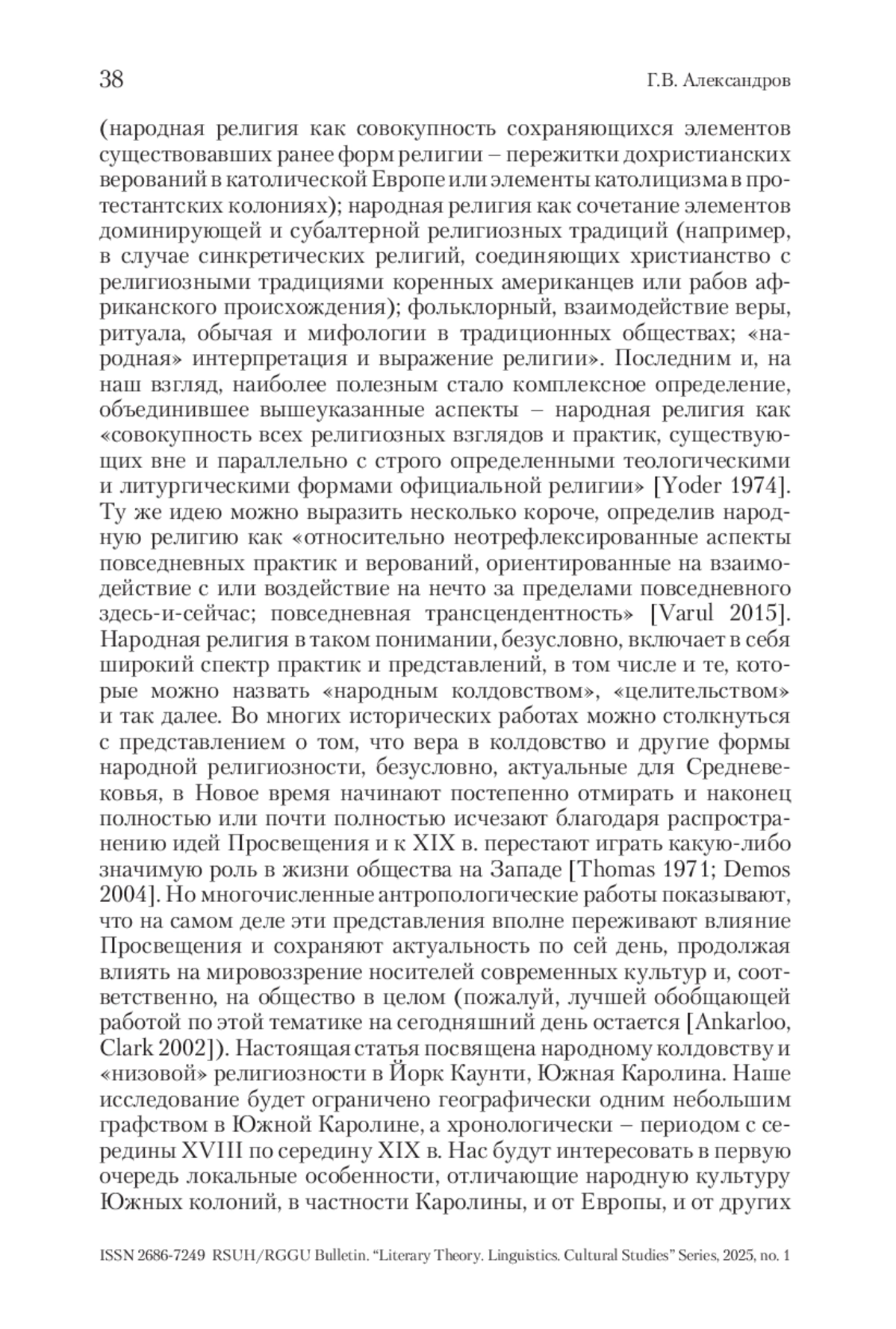 АЛЕКСАНДРОВ Г. В. THE DEVIL WAS HER DEITY: НАРОДНОЕ КОЛДОВСТВО В ГРАФСТВЕ ЙОРК, ЮЖНАЯ КАРОЛИНА, В XVIII–XIX ВВ. // ВЕСТНИК РГГУ. СЕРИЯ «ЛИТЕРАТУРОВЕДЕНИЕ. ЯЗЫКОЗНАНИЕ. КУЛЬТУРОЛОГИЯ». 2025. № 1