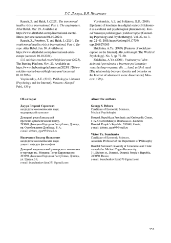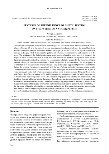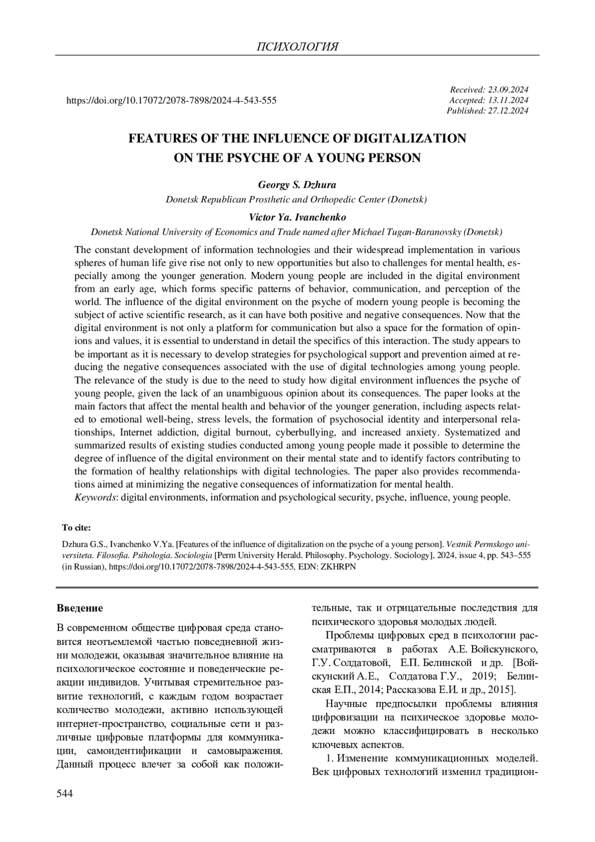 ДЖУРА Г. С., ИВАНЧЕНКО В. Я. ОСОБЕННОСТИ ВЛИЯНИЯ ЦИФРОВИЗАЦИИ НА ПСИХИКУ ЛИЧНОСТИ МОЛОДОГО ЧЕЛОВЕКА // ВЕСТНИК ПЕРМСКОГО УНИВЕРСИТЕТА. ФИЛОСОФИЯ. ПСИХОЛОГИЯ. СОЦИОЛОГИЯ. 2024. № 4