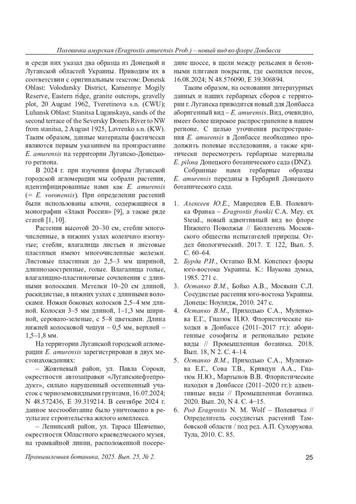 1. Алексеев Ю.Е., Мавродиев Е.В. Полевичка Франка - Eragrostis frankii C.A. Mey. ex Steud., новый адвентивный вид во флоре Нижнего Поволжья // Бюллетень Московского общества испытателей природы. Отдел биологический. 2017. Т. 122, Вып. 5. С. 60-64.