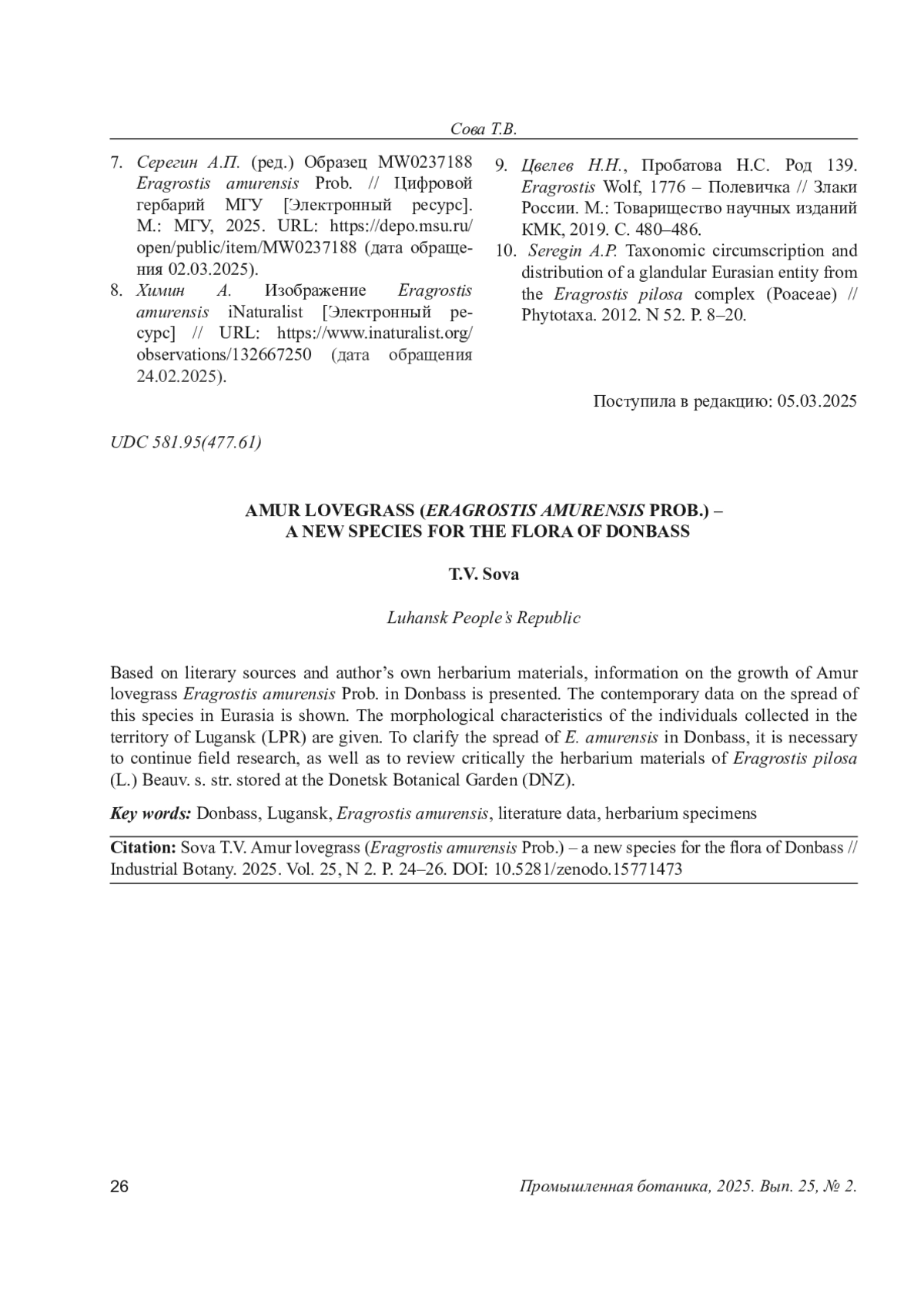 7. Серегин А.П. (ред.) Образец MW0237188 Eragrostis amurensis Prob. // Цифровой гербарий МГУ [Электронный ресурс]. М.: МГУ, 2025. URL: https://depo.msu.ru/open/public/item/MW0237188 (дата обращения 02.03.2025).
