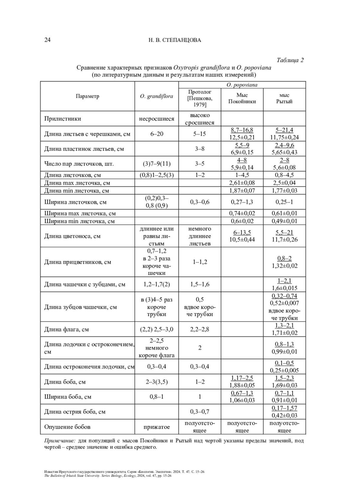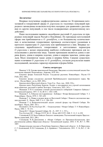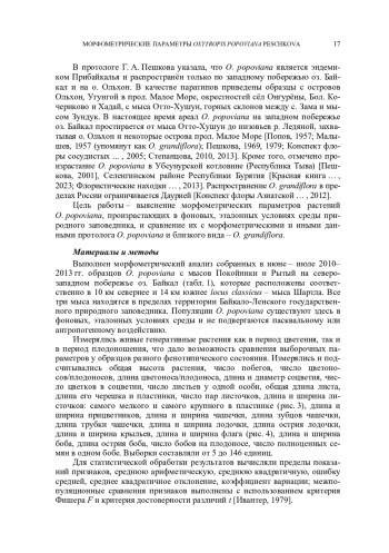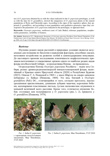 Впервые исследованы морфометрические показатели (высота растения, количество, длина и ширина вегетативных и генеративных органов) живых экземпляров редкого эндемичного остролодочника Попова (Oxytropis popoviana Peschkova) из эталонных природных популяций северо-западного побережья оз. Байкал. Изучена изменчивость различных признаков. Проведено сравнение полученных морфометрических параметров O. popoviana с приведёнными в протологе данного вида и с параметрами близкого вида Oxytropis grandiflora (Pall.) DC.