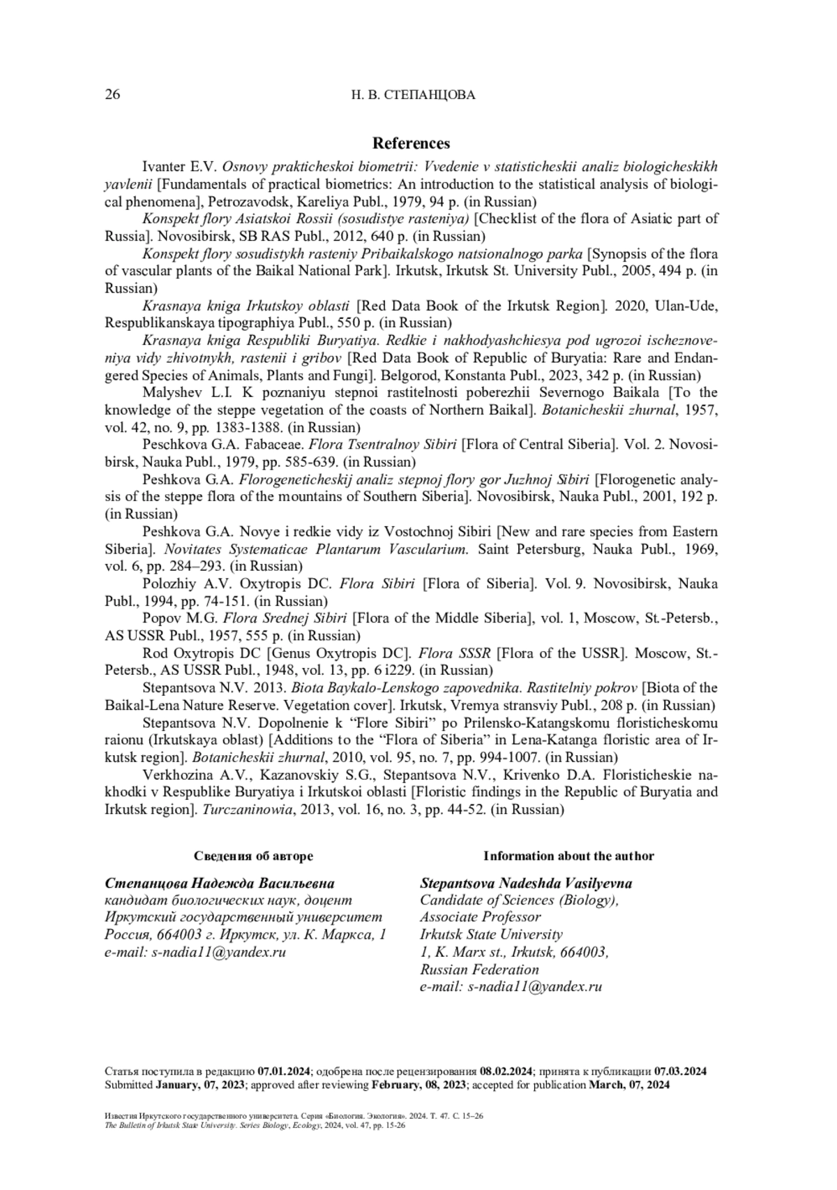 14. Степанцова Н. В. Дополнение к “Флоре Сибири” по Приленско-Катангскому флористическому району (Иркутская область) // Ботанический журнал. 2010. Т. 95, № 7. С. 994-1007.