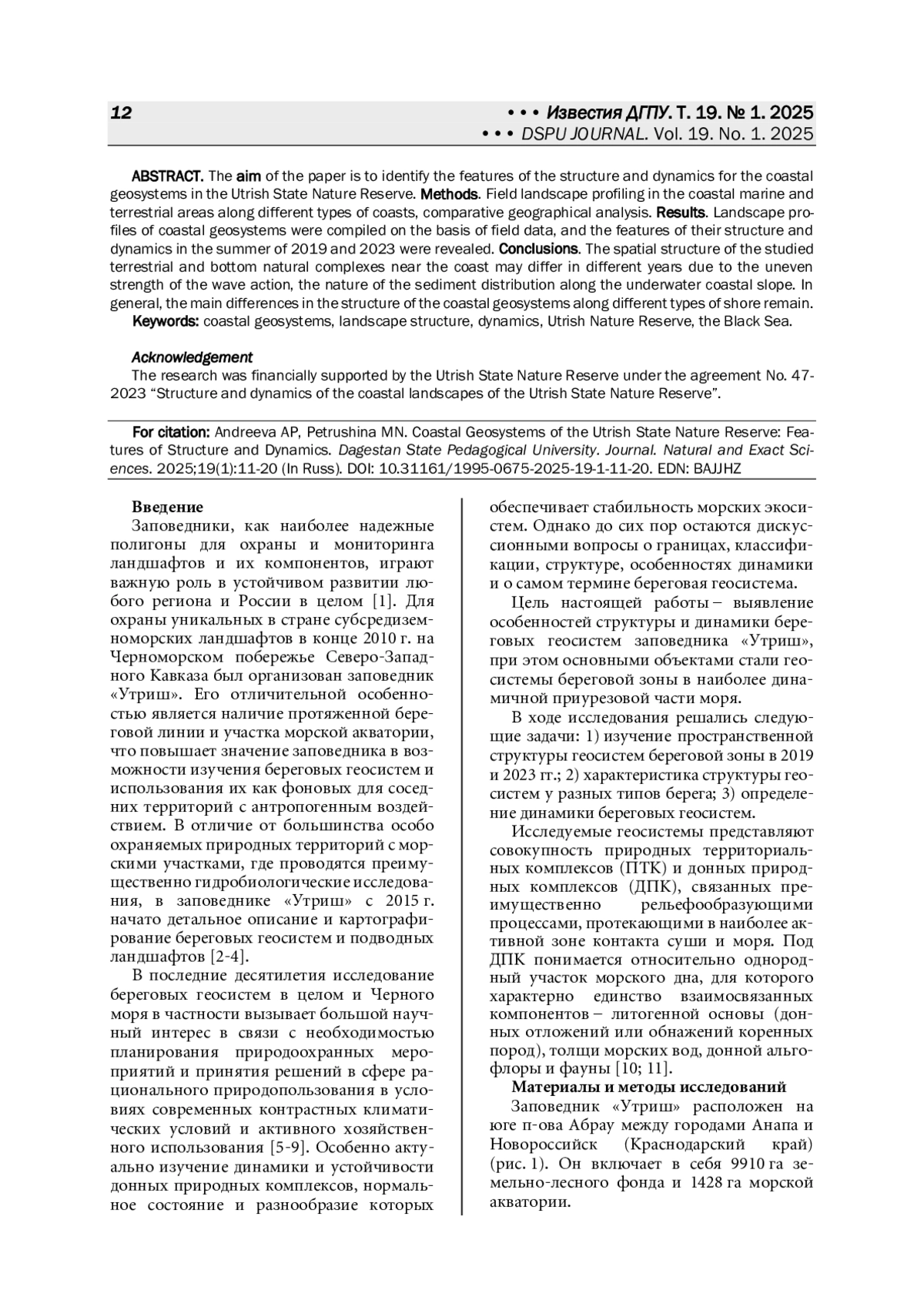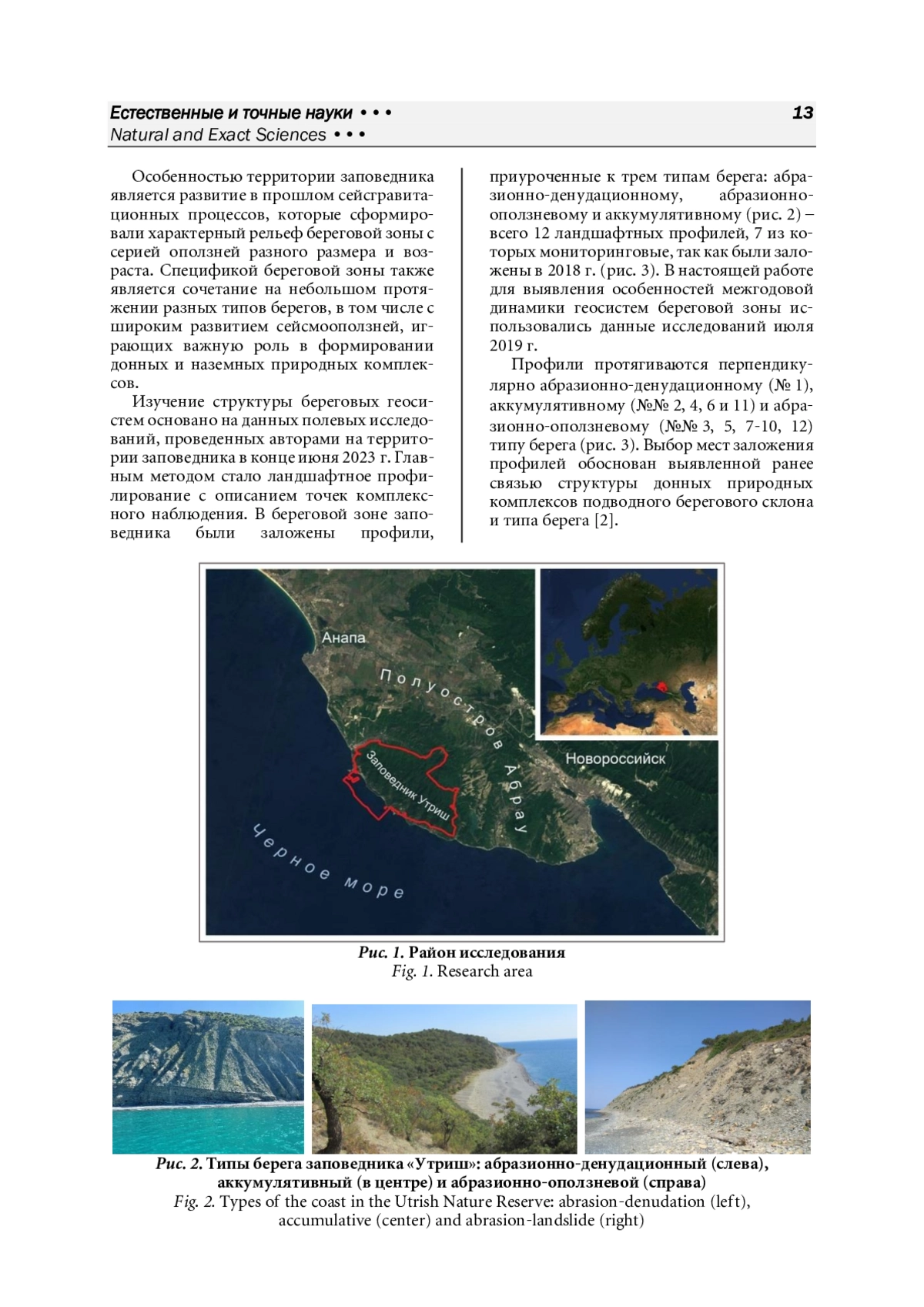 Целью работы является выявление особенностей структуры и динамики береговых геосистем Государственного природного заповедника «Утриш». Методы. Полевое ландшафтное профилирование в прибрежной морской и наземной части вдоль берегов разного типа, сравнительно-географический анализ. Результаты. На основе полевых данных построены ландшафтные профили береговых геосистем, выявлены особенности их структуры и динамики в летний период 2019 и 2023 гг. Выводы. Пространственная структура изученных наземных и донных природных комплексов у берегов в разные годы может отличаться вследствие неодинаковой силы волнового воздействия, характера распределения отложений вдоль подводного берегового склона. В целом основные различия в структуре приурезовой части у разных типов берега сохраняются.