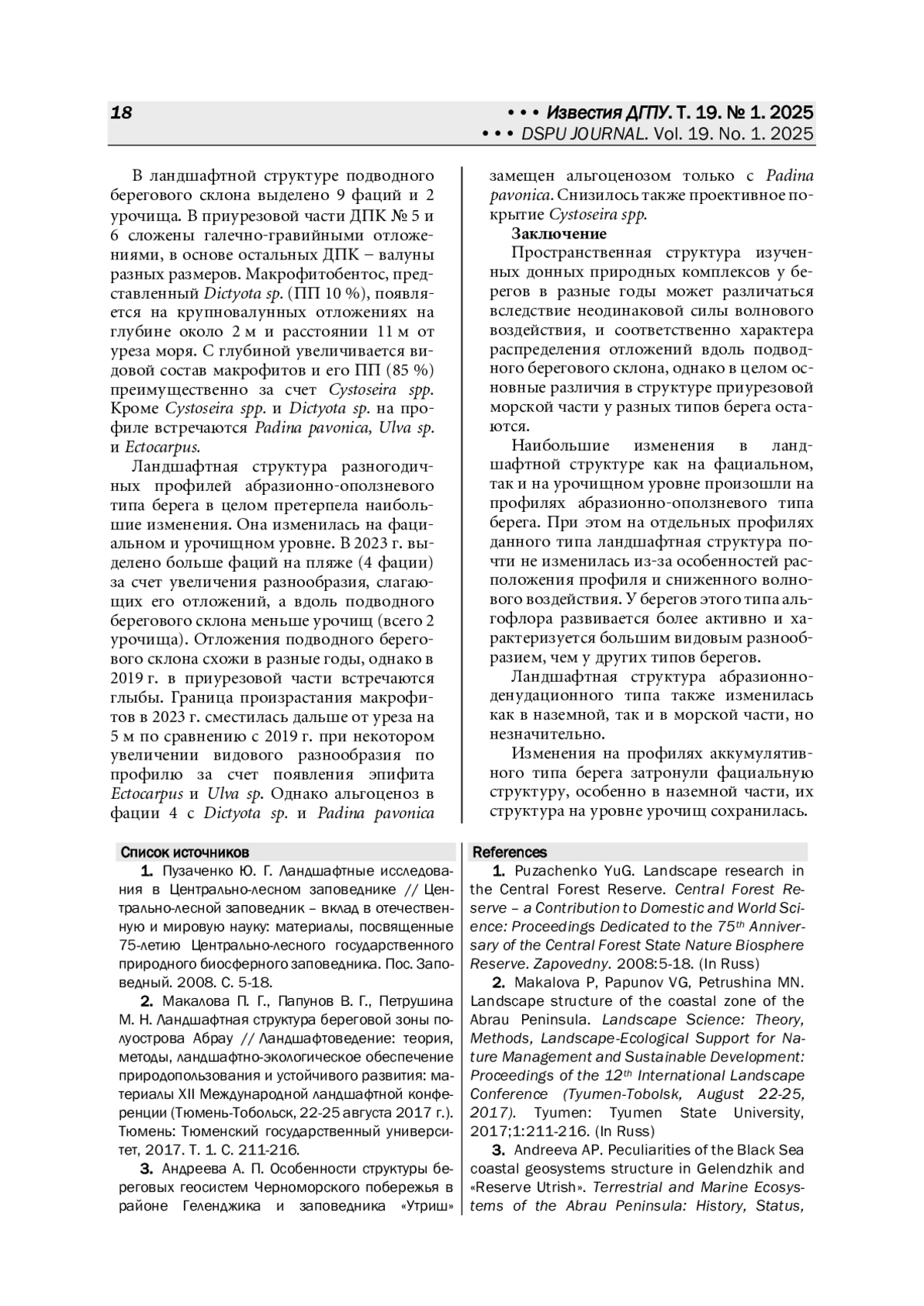 2. Макалова П. Г., Папунов В. Г., Петрушина М. Н. Ландшафтная структура береговой зоны полуострова Абрау // Ландшафтоведение: теория, методы, ландшафтно-экологическое обеспечение природопользования и устойчивого развития: материалы XII Международной ландшафтной конференции (Тюмень-Тобольск, 22-25 августа 2017 г.). Тюмень: Тюменский государственный университет, 2017. Т. 1. С. 211-216.