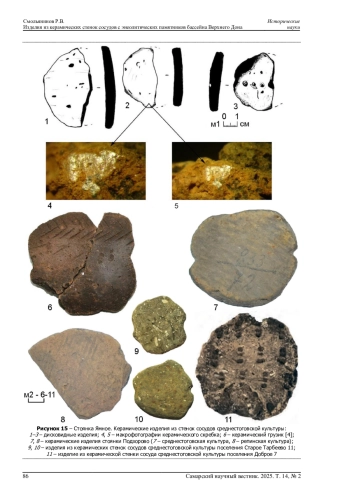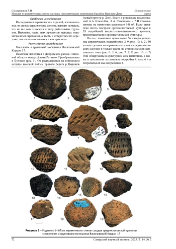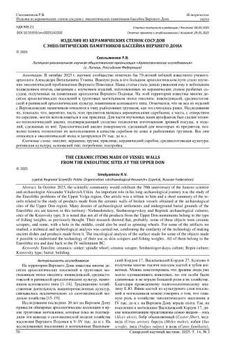 В октябре 2025 г. научное сообщество отметило бы 70-летний юбилей известного ученого-археолога Александра Витальевича Уткина. Важную роль в его большом археологическом пути стало изучение энеолитической проблематики Верхнего Поволжья. Наша статья стала данью уважения ему и небольшим подведением итогов, связанным с изучением изделий, изготовленных из керамических стенок разбитых сосудов, полученных на памятниках археологии Верхнего Подонья. На этой территории известны многие десятки археологических поселений и грунтовых могильников эпохи энеолита: нижнедонской, среднестоговской и репинской археологических культур, памятников ксизовского типа. Отмечается, что не все из изделий с Верхнедонских памятников относятся к типу рыболовных грузиков, как это считалось ранее. Исследования их, показало, что, вероятно, часть этих предметов являлась керамическими скребками, а часть, с отверстием по середине, могли использоваться и как пряслица. Для части изученных нами артефактов был сделан технико-технологический анализ, подтверждающий сходство технологии изготовления древней посуды, и изделий, сделанных из неё. Трасологический анализ поверхности, сделанный для некоторых из предметов, позволил понять технологию их использования в качестве скребков по коже и рыболовных грузиков. Все они относятся к энеолитической эпохе и датируются IV тыс. до н. э.