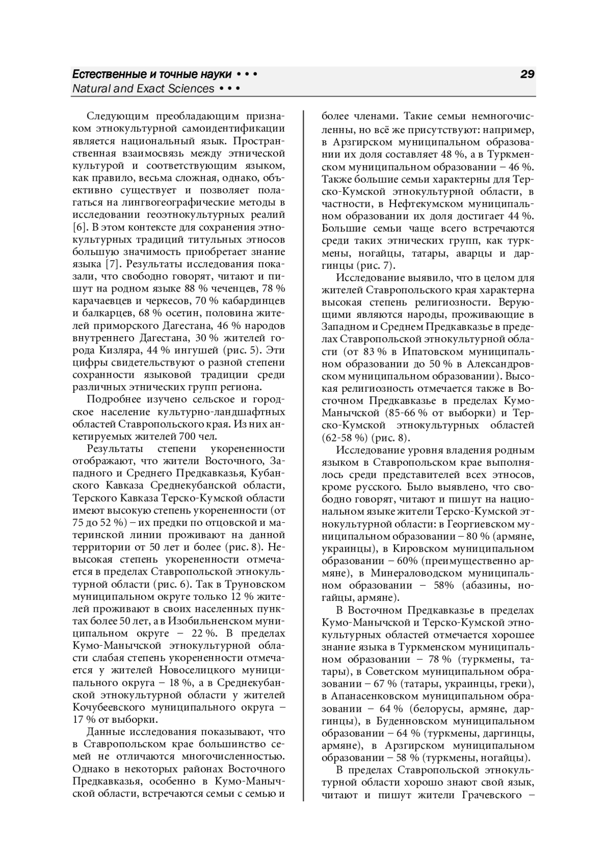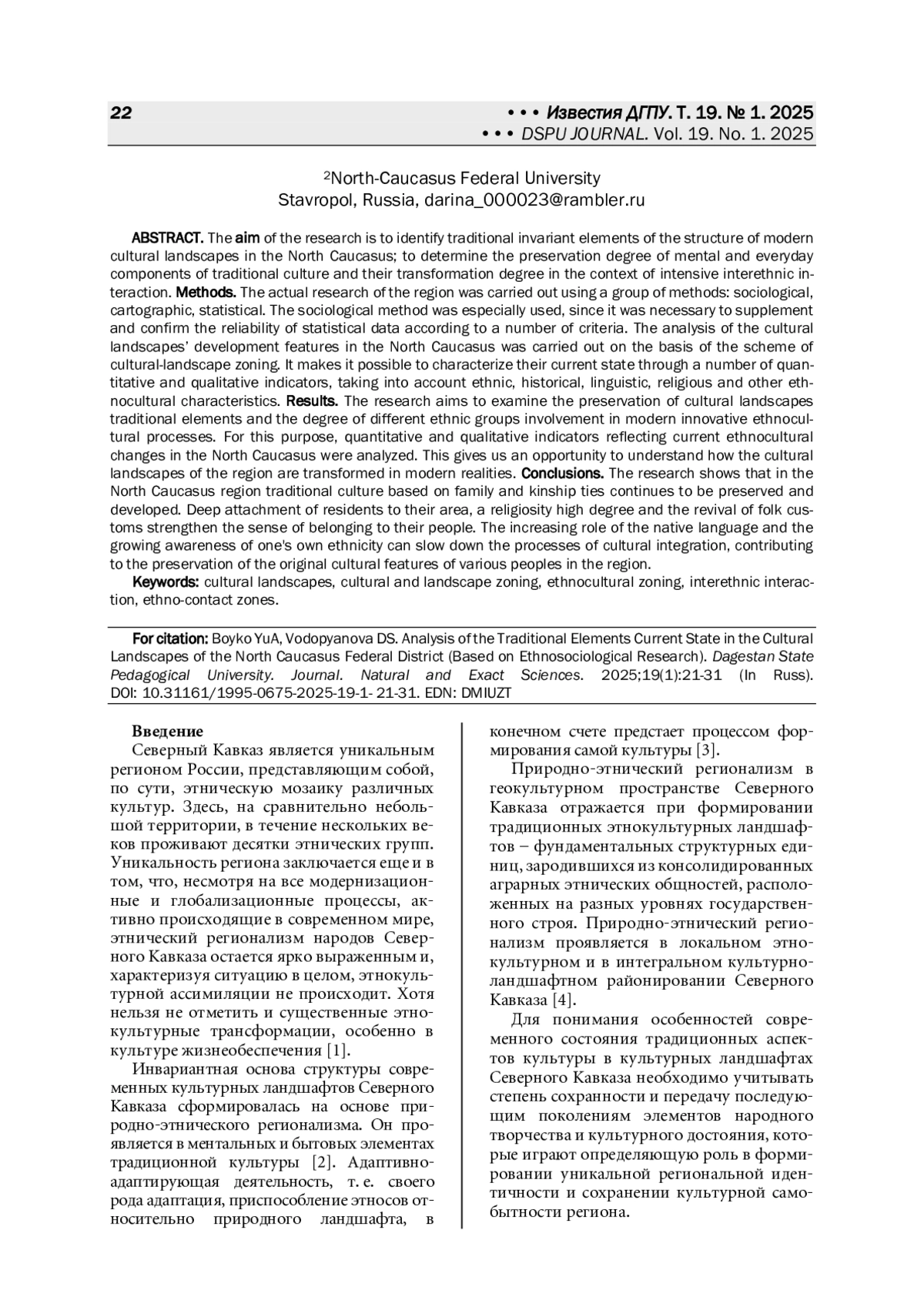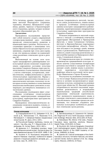 Цели - выявление традиционных инвариантных элементов структуры современных культурных ландшафтов Северного Кавказа; определение степени сохранности ментальных и бытовых компонентов традиционной культуры и степени их трансформации в условиях интенсивного межэтнического взаимодействия. Методы. Актуальные исследования региона осуществлялись с помощью группы методов: социологических, картографических, статистических. В особенности применялся социологический метод, поскольку по ряду критериев необходимо было дополнить и подтвердить достоверность статистических данных. Анализ особенностей развития культурных ландшафтов Северного Кавказа проводился на основе схемы культурно-ландшафтного районирования. Он позволяет охарактеризовать их современное состояние через ряд количественных и качественных показателей с учетом этнических, исторических, лингвистических, конфессиональных и других этнокультурных характеристик. Результаты. Исследование направлено на изучение сохранности традиционных элементов культурных ландшафтов и степени вовлеченности разных этнических групп в современные инновационные этнокультурные процессы. С этой целью были проанализированы количественные и качественные показатели, отражающие текущие этнокультурные изменения на Северном Кавказе, позволяющие понять, как трансформируются культурные ландшафты региона в современных реалиях. Выводы. Исследование показывает, что в Северо-Кавказском регионе продолжает сохраняться и развиваться традиционная культура, базирующаяся на семейных и родственных связях. Глубокая привязанность жителей к своей местности, высокая степень религиозности и возрождение народных обычаев укрепляют чувство принадлежности к своему народу. Повышение роли родного языка и рост осознания собственной этничности способны замедлить процессы культурной интеграции, способствуя сохранению самобытных культурных черт различных народов региона.