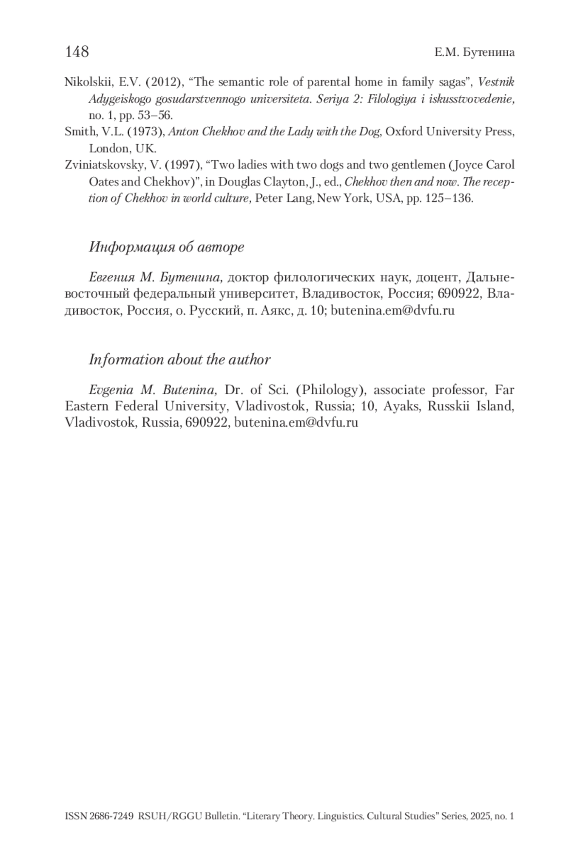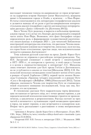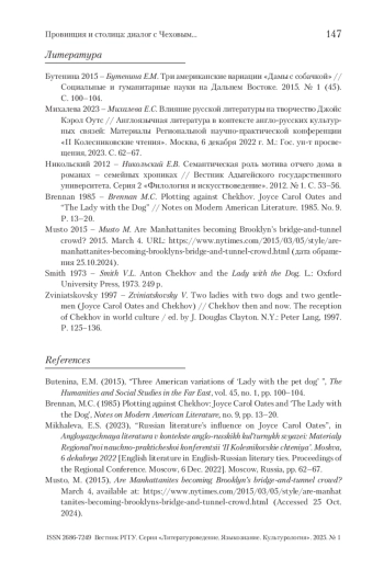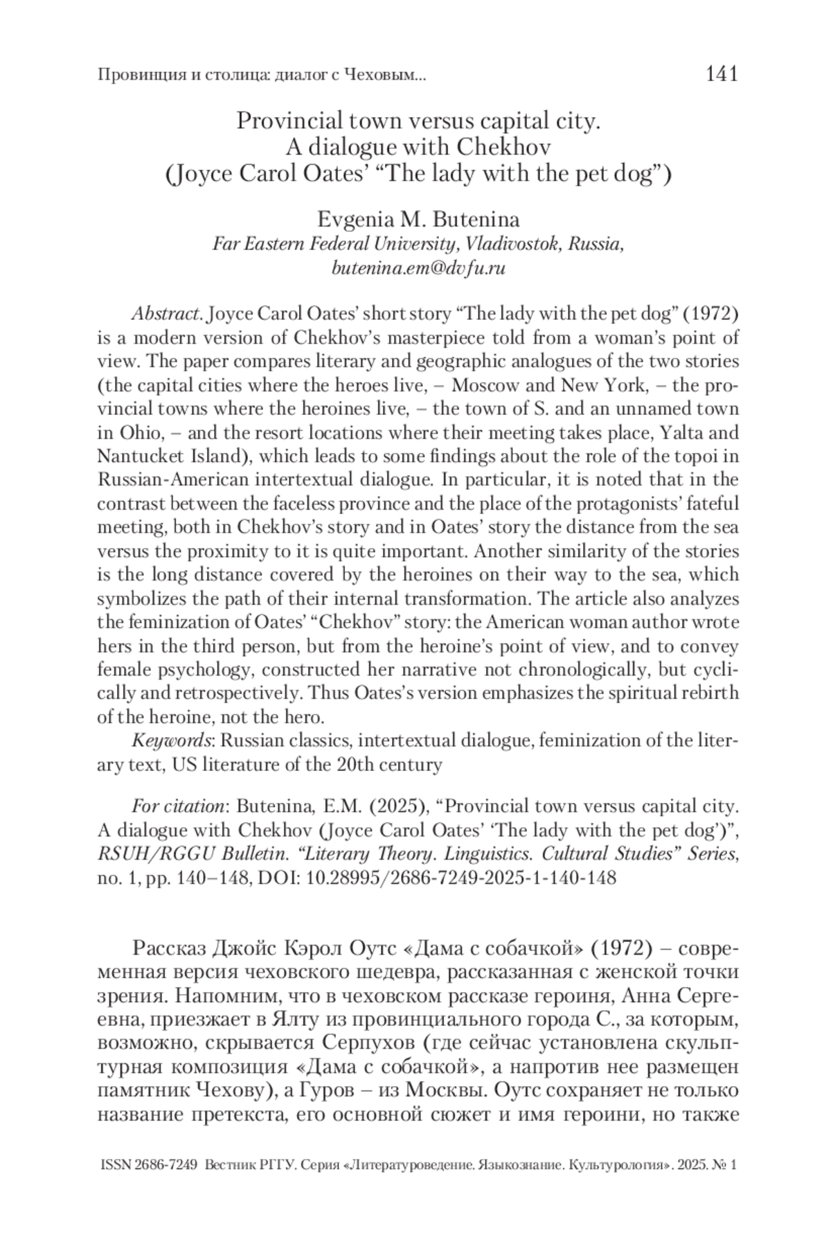 БУТЕНИНА Е. М. ПРОВИНЦИЯ И СТОЛИЦА: ДИАЛОГ С ЧЕХОВЫМ (РАССКАЗ ДЖОЙС КЭРОЛ ОУТС «ДАМА С СОБАЧКОЙ») // ВЕСТНИК РГГУ. СЕРИЯ «ЛИТЕРАТУРОВЕДЕНИЕ. ЯЗЫКОЗНАНИЕ. КУЛЬТУРОЛОГИЯ». 2025. № 1