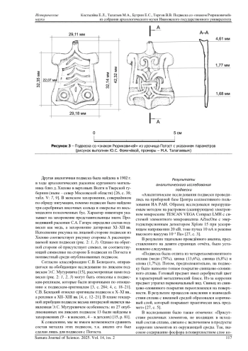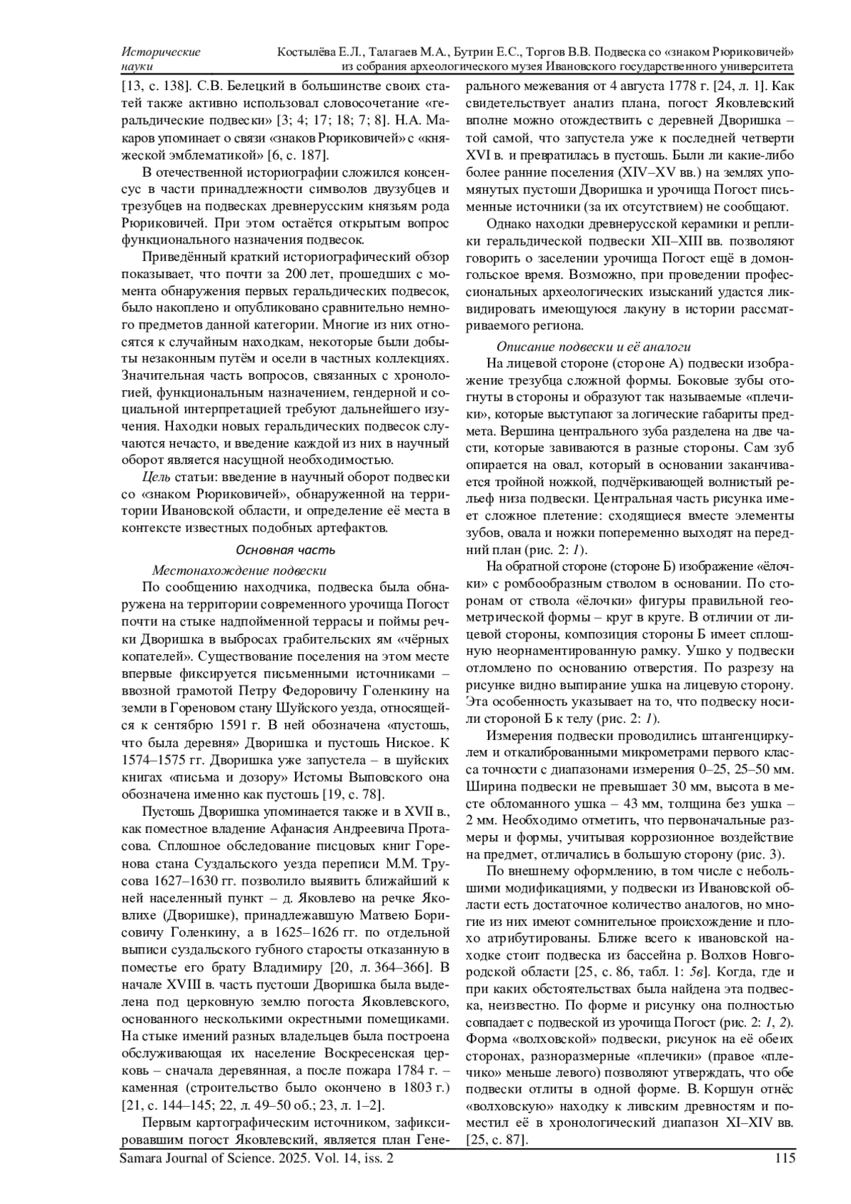 В статье публикуется подвеска со «знаком Рюриковичей». Она была найдена случайно на территории разрушенного древнерусского поселения в Комсомольском районе Ивановской области. Это второй артефакт со «знаком Рюриковичей», обнаруженный на территории Ивановской области. Первый - топорик из могильника Шекшово (Гаврилово-Посадский район) был найден во время раскопок Суздальской археологической экспедиции Института археологии РАН (ИА РАН) под руководством академика Н. А. Макарова в 2012 году. Аналитические исследования подвески, проведённые в ИА РАН, установили, что подвеска была отлита из сплава меди (Cu) 78%, цинка (Zn) 13,6%, свинца (Pb) 6,8% и олова (Sn) 1,7%. Поверхность её была покрыта коррозией, в которой обнаружилось включение элементов из окружающей среды. В частности, отмечалось высокое содержание фосфора. Возможно, в районе местонахождения подвески был могильник, и подвеска могла быть связана с погребальными принадлежностями одной из могил. Ближайшие аналогии: подвеска - из женского захоронения (№ 60) курганного могильника Хилово в верховьях Волги и случайная находка в бассейне р. Волхов в Новгородской области. Подвеску предположительно можно датировать XII-XIII веками. Эту дату могут подтвердить и обломки сосудов домонгольского облика, которые были найдены в тех же условиях, что и подвеска, на месте разрушенного древнего поселения.
