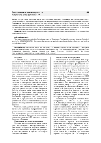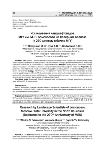 Цель работы - охарактеризовать основные направления и результаты теоретических и прикладных работ, проводимых сотрудниками и выпускниками кафедры физической географии и ландшафтоведения МГУ им. М. В. Ломоносова на Северном Кавказе. Методом исследования стал анализ литературных, фондовых и собственных полевых материалов по горной ландшафтной тематике. Результаты. Выделение и характеристика основных этапов ландшафтных исследований на основе обобщения имеющихся материалов. Выводы. Комплексные исследования горных районов Северного Кавказа, проводимые ландшафтоведами МГУ им. М. В. Ломоносова, внесли заметный вклад в изучение пространственно-временной структуры ландшафтов Северного Кавказа, разработку теории горного ландшафтоведения и физико-географического районирования горных территорий.