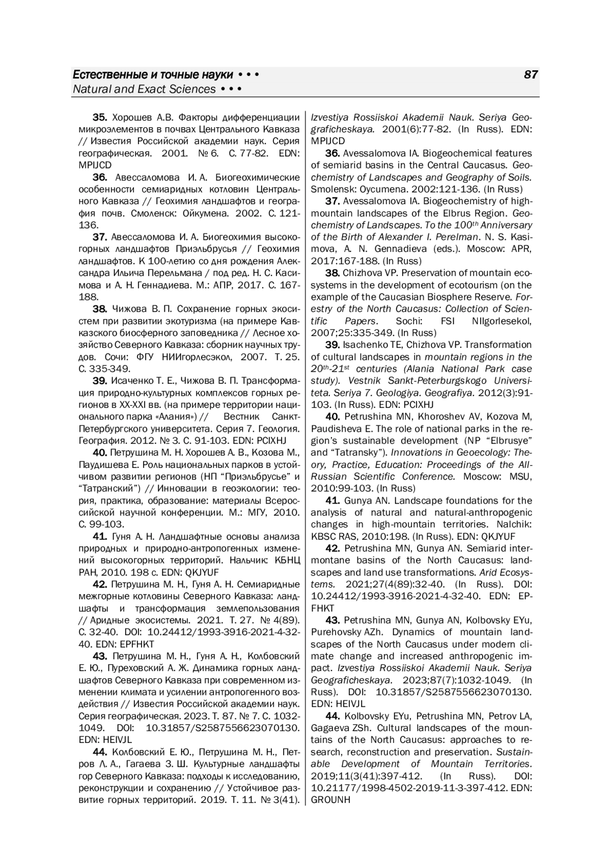 42. Петрушина М. Н., Гуня А. Н. Семиаридные межгорные котловины Северного Кавказа: ландшафты и трансформация землепользования // Аридные экосистемы. 2021. Т. 27. № 4(89). С. 32-40. DOI: 10.24412/1993-3916-2021-4-32-40