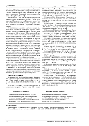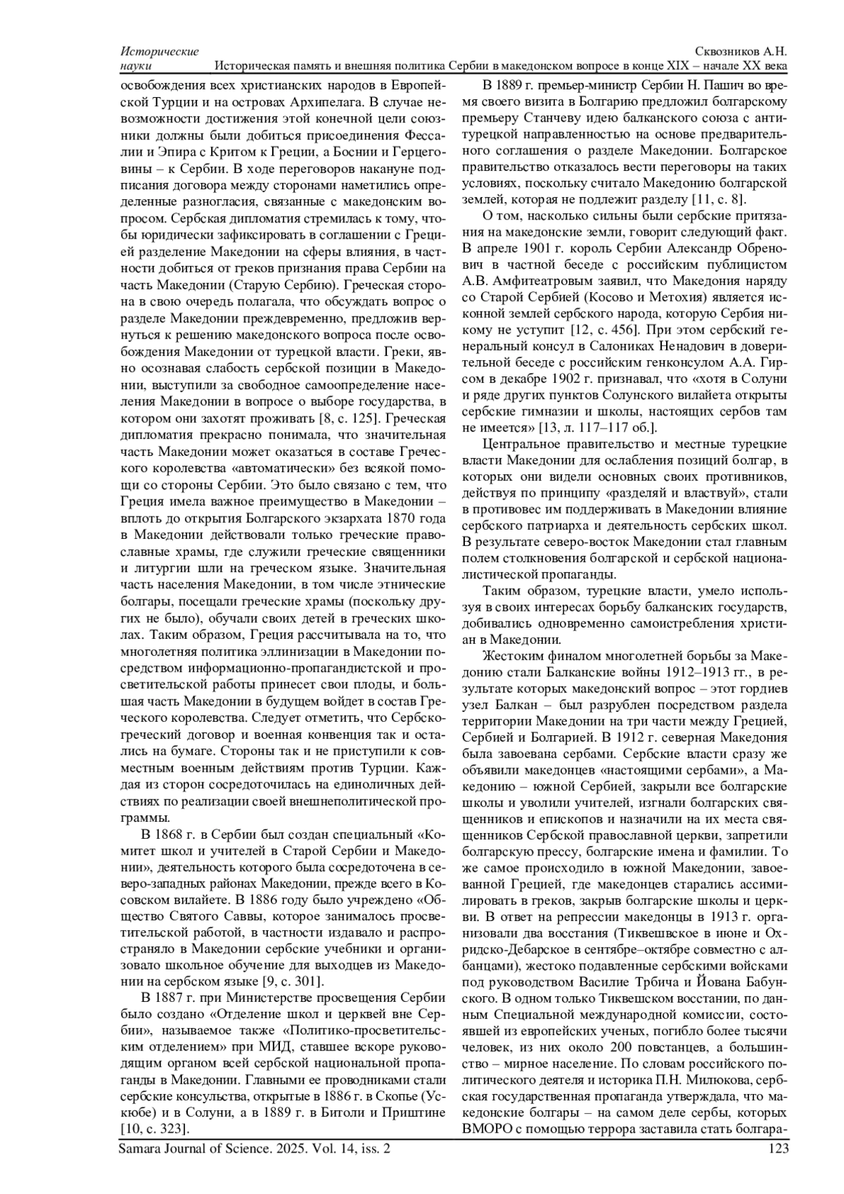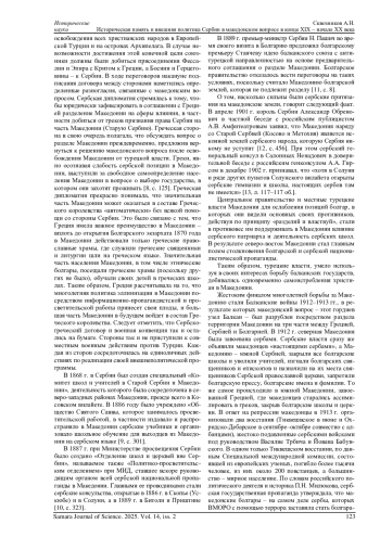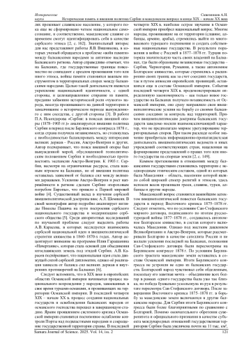 СКВОЗНИКОВ А. Н. ИСТОРИЧЕСКАЯ ПАМЯТЬ И ВНЕШНЯЯ ПОЛИТИКА СЕРБИИ В МАКЕДОНСКОМ ВОПРОСЕ В КОНЦЕ XIX - НАЧАЛЕ XX ВЕКА // САМАРСКИЙ НАУЧНЫЙ ВЕСТНИК. 2025. ТОМ 14, № 2