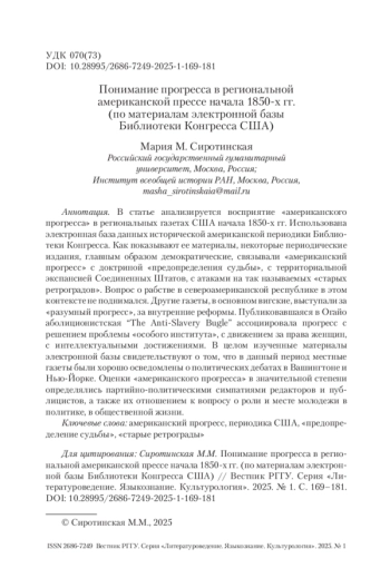 В статье анализируется восприятие «американского прогресса» в региональных газетах США начала 1850-х гг. Использована электронная база данных исторической американской периодики Библиотеки Конгресса. Как показывают ее материалы, некоторые периодические издания, главным образом демократические, связывали «американский прогресс» с доктриной «предопределения судьбы», с территориальной экспансией Соединенных Штатов, с атаками на так называемых «старых ретроградов». Вопрос о рабстве в североамериканской республике в этом контексте не поднимался. Другие газеты, в основном вигские, выступали за «разумный прогресс», за внутренние реформы. Публиковавшаяся в Огайо аболиционистская “The Anti-Slavery Bugle” ассоциировала прогресс с решением проблемы «особого института», с движением за права женщин, с интеллектуальными достижениями. В целом изученные материалы электронной базы свидетельствуют о том, что в данный период местные газеты были хорошо осведомлены о политических дебатах в Вашингтоне и Нью-Йорке. Оценки «американского прогресса» в значительной степени определялись партийно-политическими симпатиями редакторов и публицистов, а также их отношением к вопросу о роли и месте молодежи в политике, в общественной жизни.