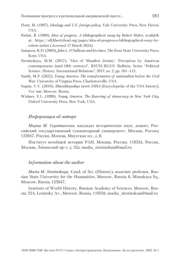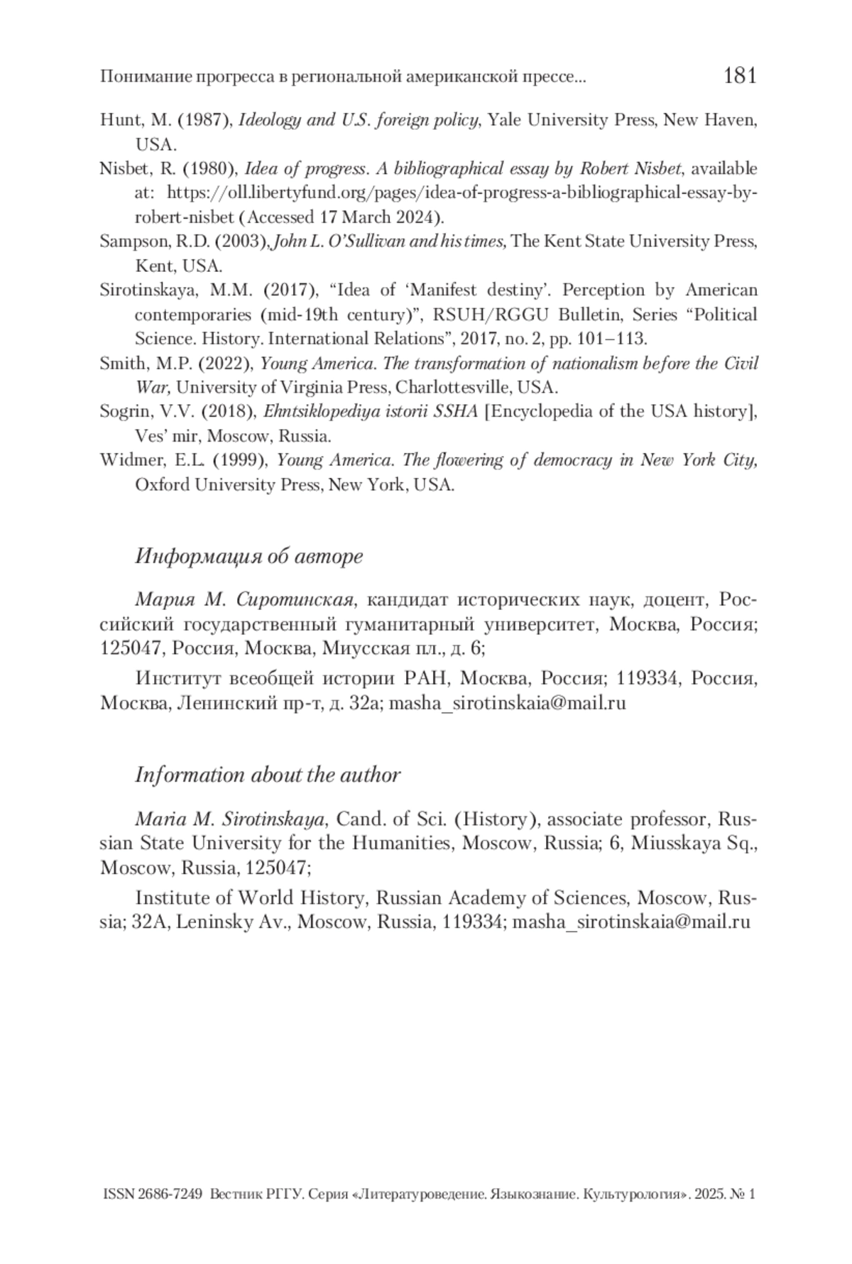 3. Сиротинская 2017 - Сиротинская М.М. Идея «предопределения судьбы» в восприятии американских современников: середина XIX в. // Вестник РГГУ. Серия «Политология. История. Международные отношения». 2017. № 2. С. 101-113.