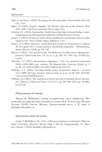 3. Прилуцкий 2017 - Прилуцкий В.В. Мормонская полигамия в Юте и на западных территориях США (1850-1890-е гг.) // Вестник Брянского государственного университета. 2017. № 2. C. 96-101. https://doi.org/10.22281/2413-9912-2023-07-04-105-115.