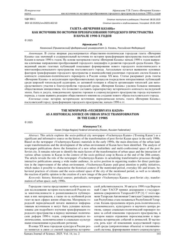АФАНАСЬЕВА Т. В. ГАЗЕТА «ВЕЧЕРНЯЯ КАЗАНЬ» КАК ИСТОЧНИК ПО ИСТОРИИ ПРЕОБРАЗОВАНИЯ ГОРОДСКОГО ПРОСТРАНСТВА В НАЧАЛЕ 1990-Х ГОДОВ // САМАРСКИЙ НАУЧНЫЙ ВЕСТНИК. 2025. ТОМ 14, № 2