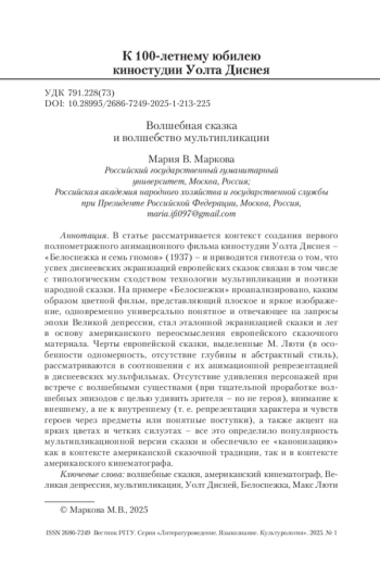 В статье рассматривается контекст создания первого полнометражного анимационного фильма киностудии Уолта Диснея – «Белоснежка и семь гномов» (1937) – и приводится гипотеза о том, что успех диснеевских экранизаций европейских сказок связан в том числе с типологическим сходством технологии мультипликации и поэтики народной сказки. На примере «Белоснежки» проанализировано, каким образом цветной фильм, представляющий плоское и яркое изображение, одновременно универсально понятное и отвечающее на запросы эпохи Великой депрессии, стал эталонной экранизацией сказки и лег в основу американского переосмысления европейского сказочного материала. Черты европейской сказки, выделенные М. Люти (в особенности одномерность, отсутствие глубины и абстрактный стиль), рассматриваются в соотношении с их анимационной репрезентацией в диснеевских мультфильмах. Отсутствие удивления персонажей при встрече с волшебными существами (при тщательной проработке волшебных эпизодов с целью удивить зрителя – но не героя), внимание к внешнему, а не к внутреннему (т. е. репрезентация характера и чувств героев через предметы или понятные поступки), а также акцент на ярких цветах и четких силуэтах – все это определило популярность мультипликационной версии сказки и обеспечило ее «канонизацию» как в контексте американской сказочной традиции, так и в контексте американского кинематографа.